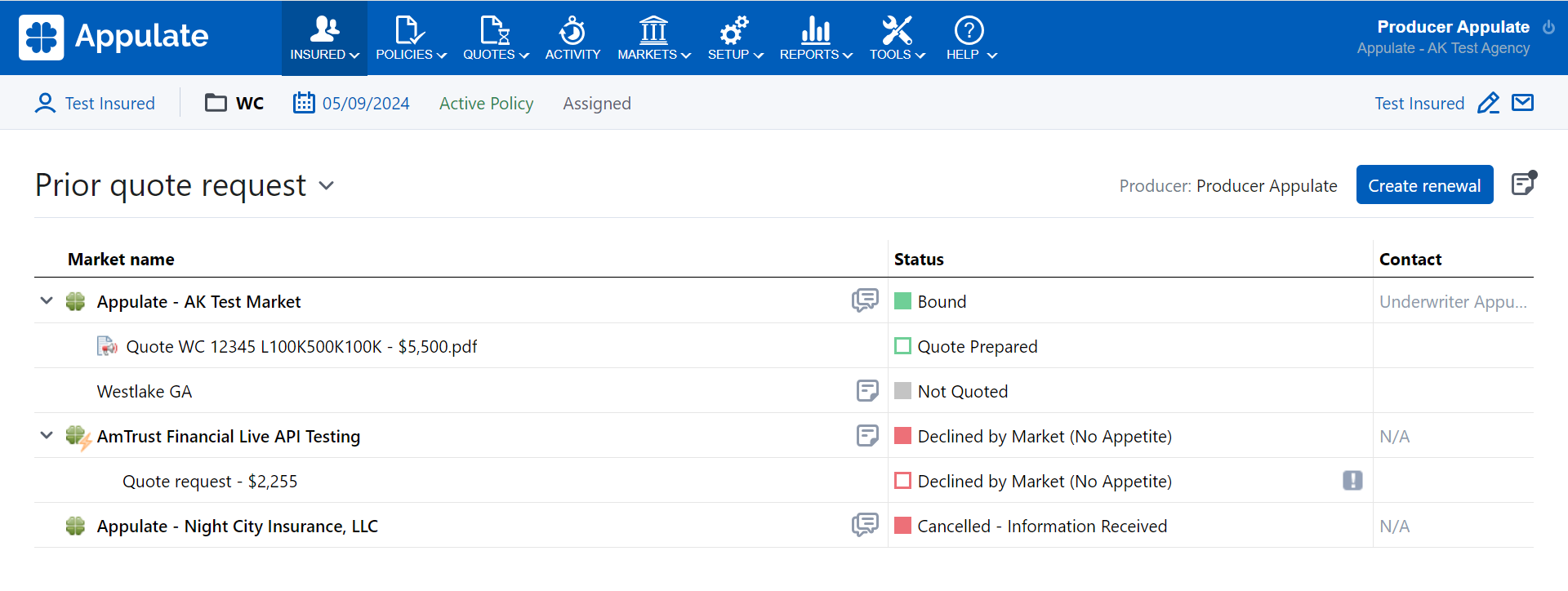 - If available, assigned Producer (for agencies), Underwriter (for markets), and CSR from the prior quote request's Summary.