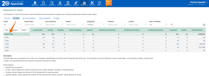 | By Date | Years when RFQs were created (first level; only RFQs created from 2005 through 2025 inclusive are counted), quarters when the RFQs were created (second level), and months when the RFQs were created (third level). |