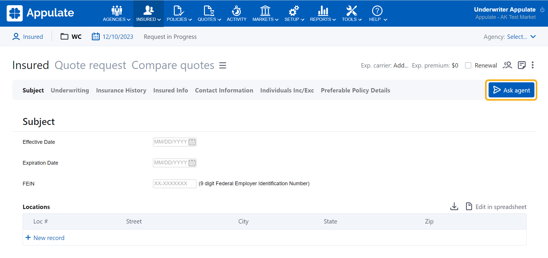 - Send to complete (for agency users and market users) on the Insured tab