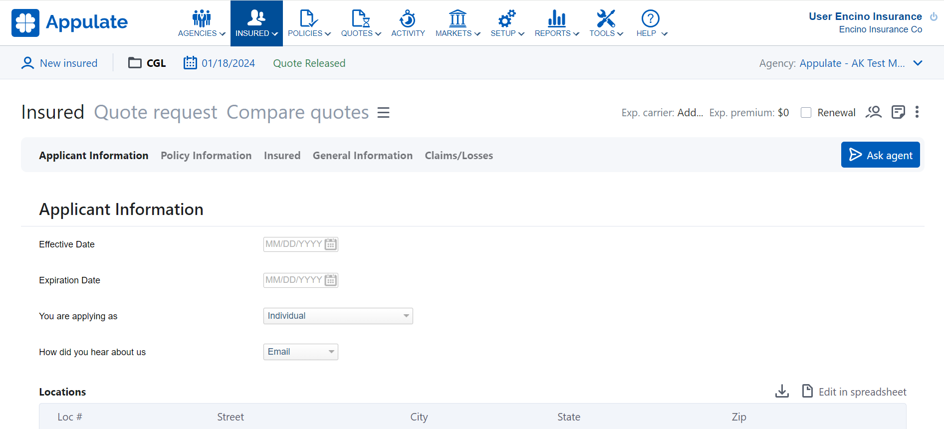 Apart from the Insured tab questionnaire, which contains general information about the insured, Appulate has the Market Smart Q&A feature, which are market-specific questionnaires.