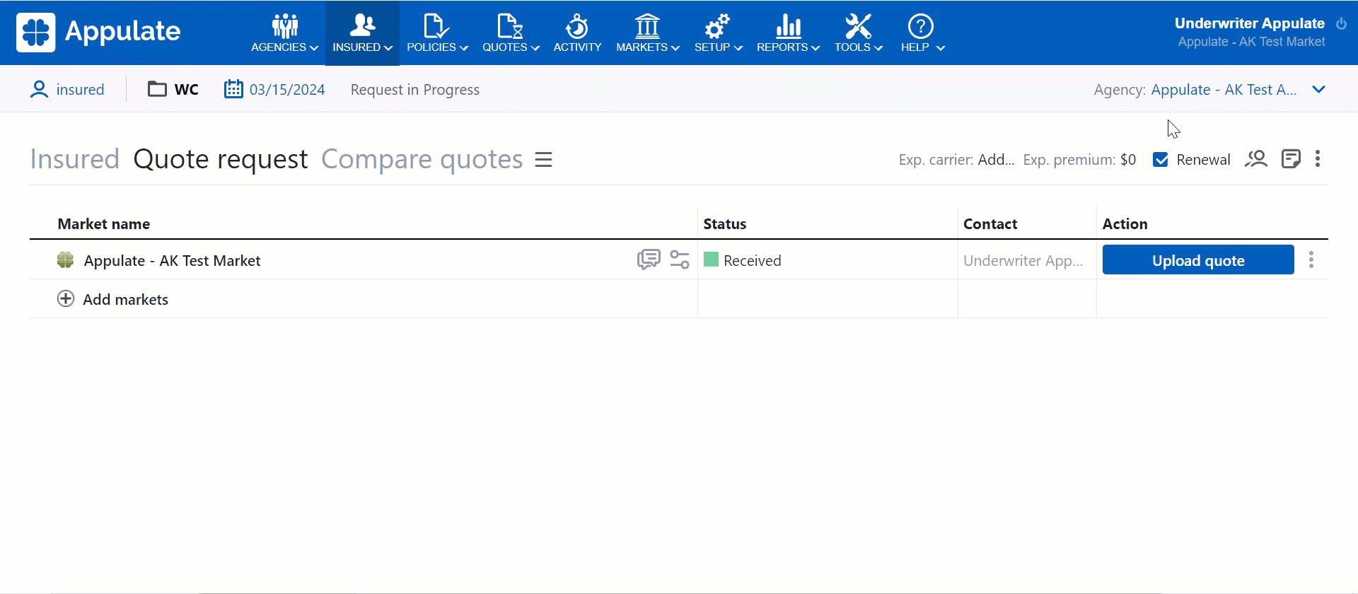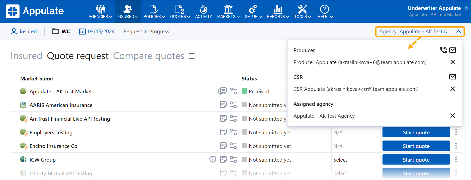 As a market user, you can only assign an agency, Producer, and CSR to a quote request or policy if your market has created this quote request or policy.