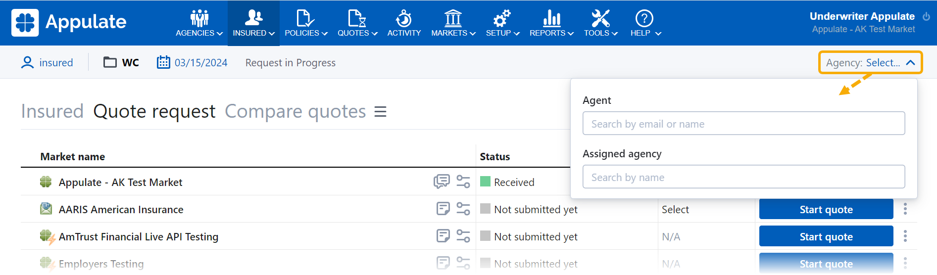 - Click Agency: Select... on the Quote request or Policy page.