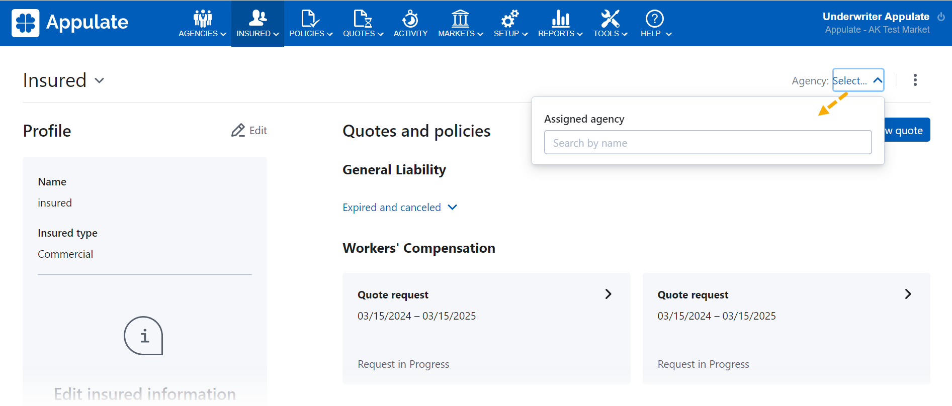 - the Insured page. This will open a dropdown with the Assigned agency field.