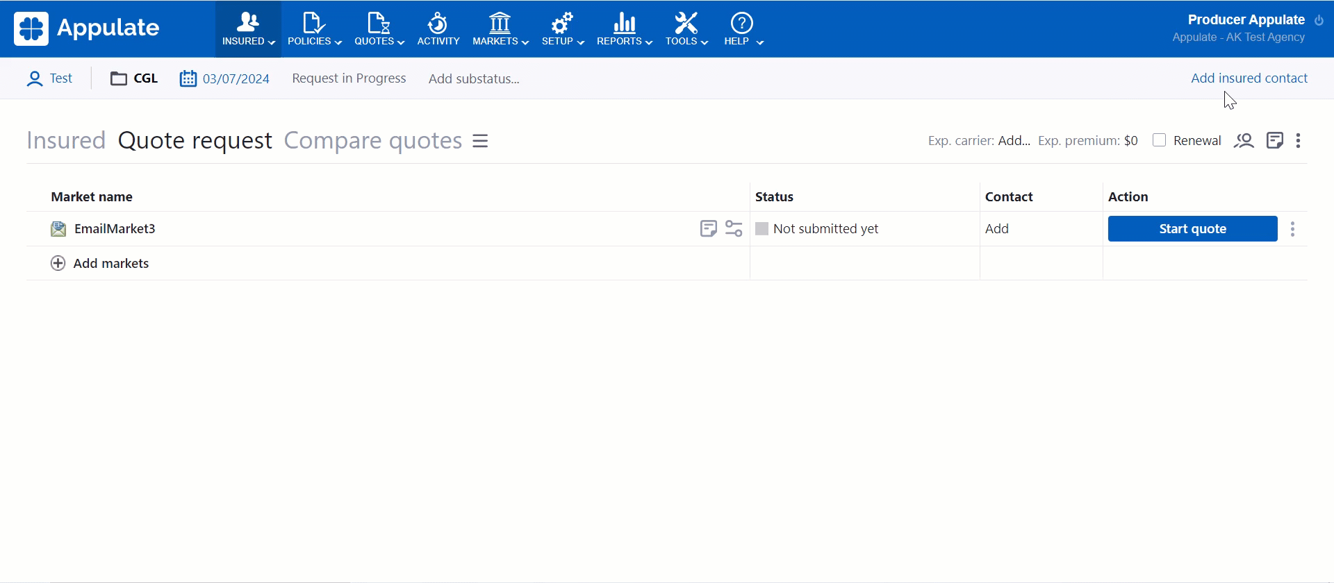 You can either select the insured from the list of previously specified insured contacts, or add a new insured contact. This isn't available to market users. |