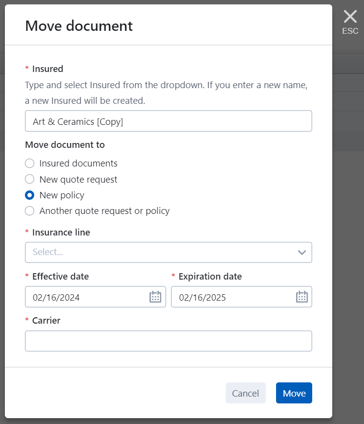 In Appulate, you can use the Move document dialog to transfer a document to another insured (both existing and new), quote request, or policy.