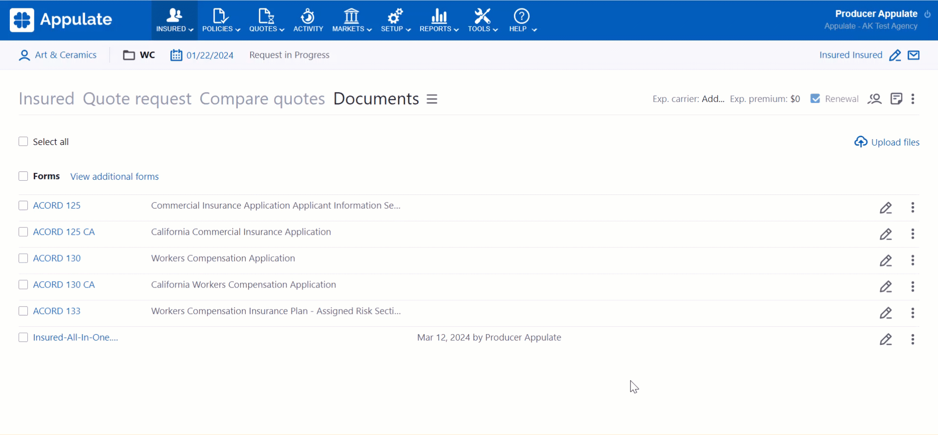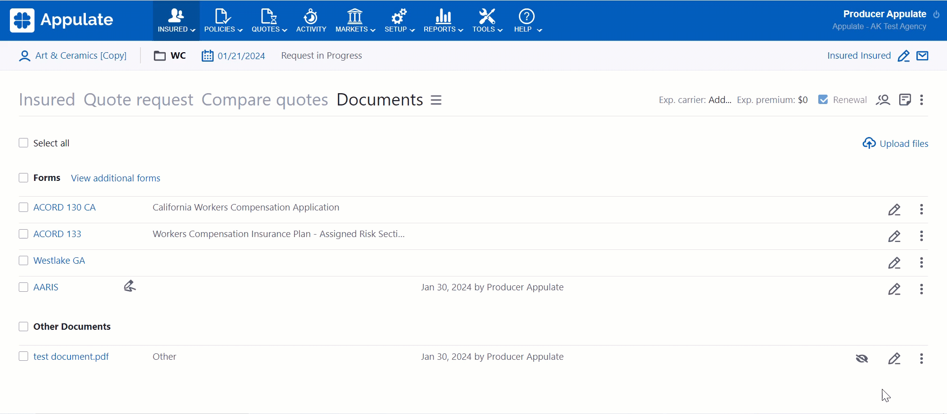 - documents on the Documents page for quote requests and policies;