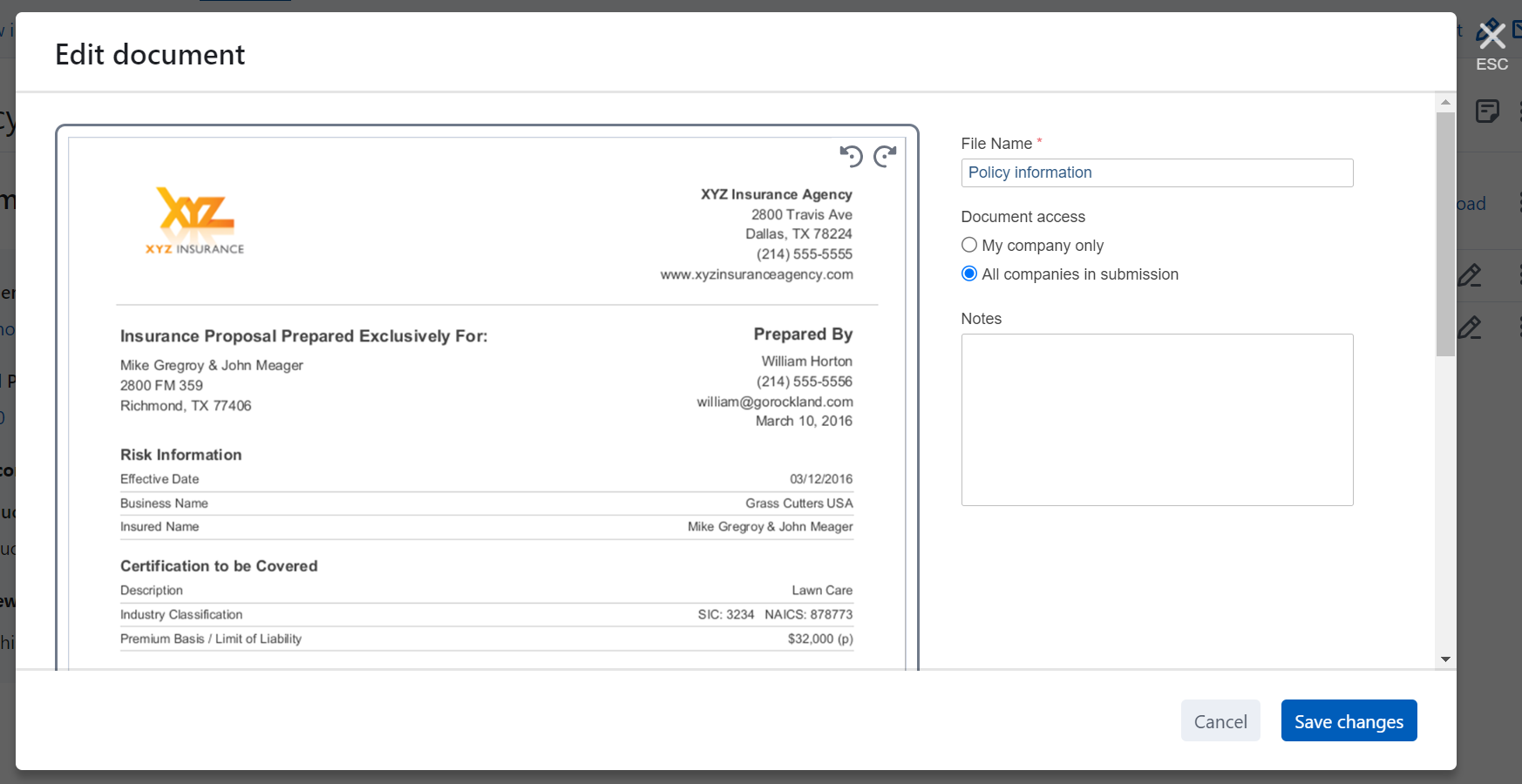 Edit document dialog