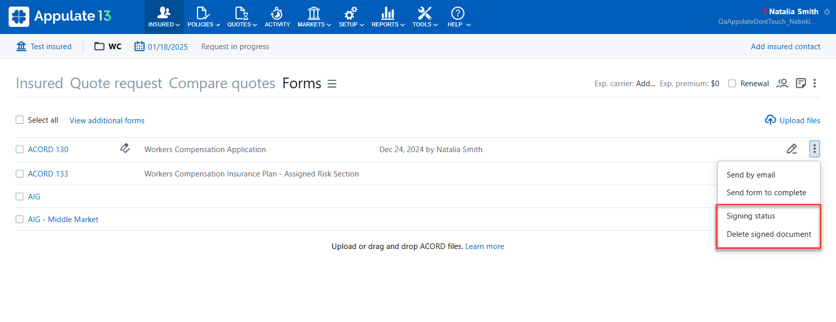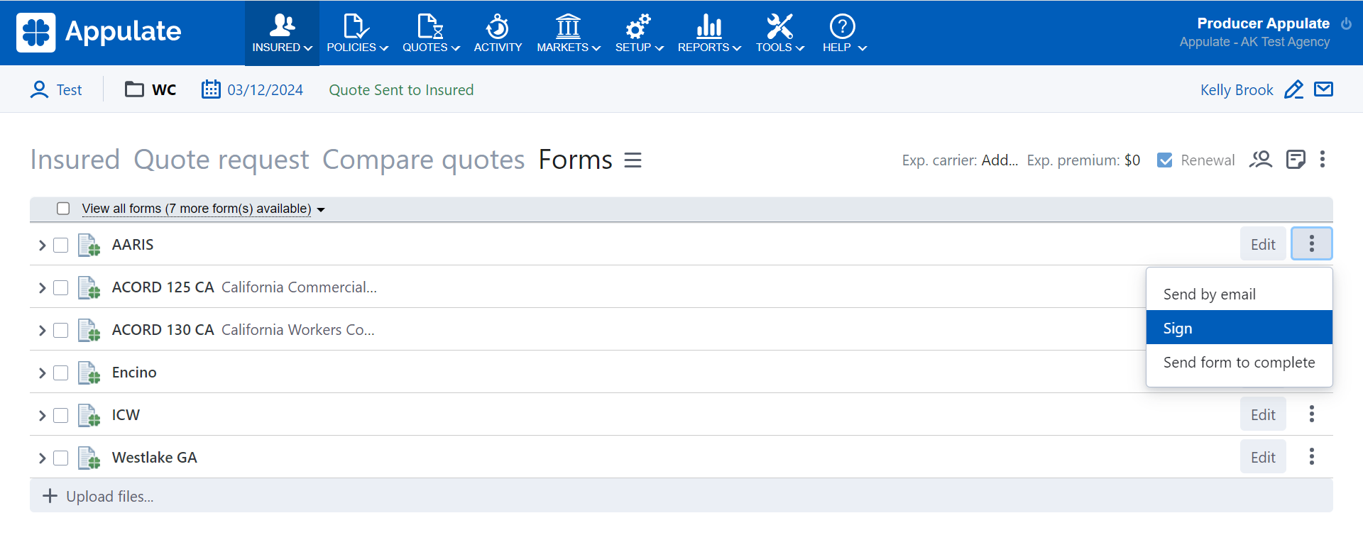 Requesting a quote or policy from a market often requires you to sign various documents.