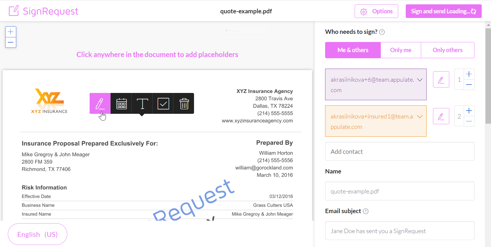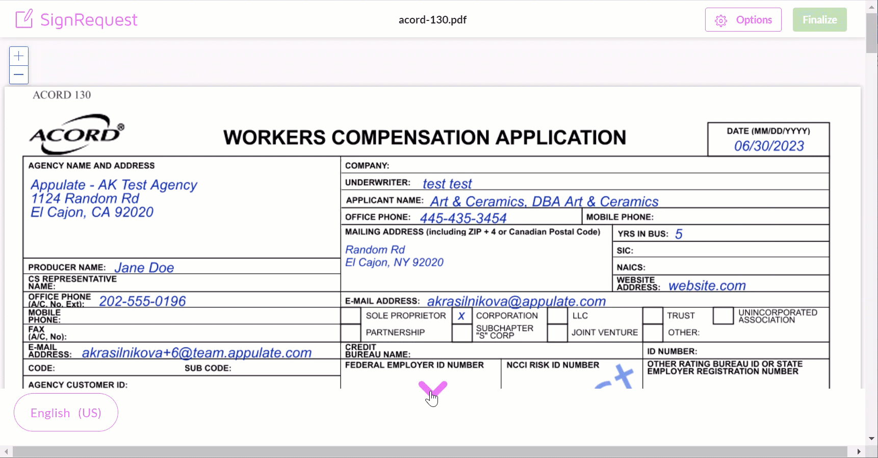 Just click the place you want to be signed, click the pencil icon, and confirm the signer. Please note that the signer and the Applicant you have selected in Appulate have to match. - sign the document yourself.
