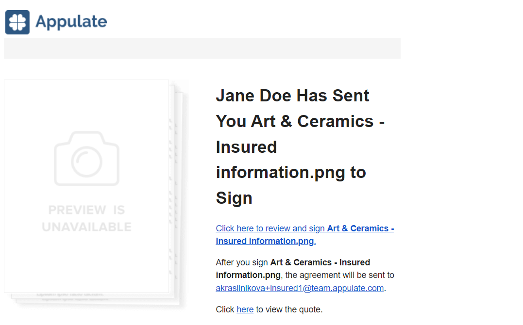 - A link to the quote request in Appulate (not applicable to the insured).