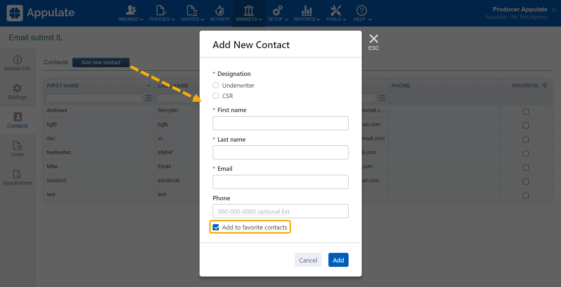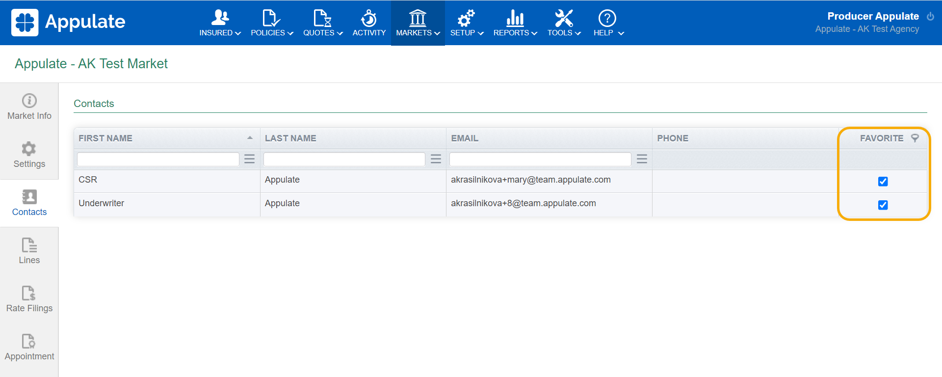 Available to agencies and MGAs, Appulate's favorite contacts feature is there to help you find and assign market contacts you are working with on a request for a quote. Favorite contacts are company-wide.