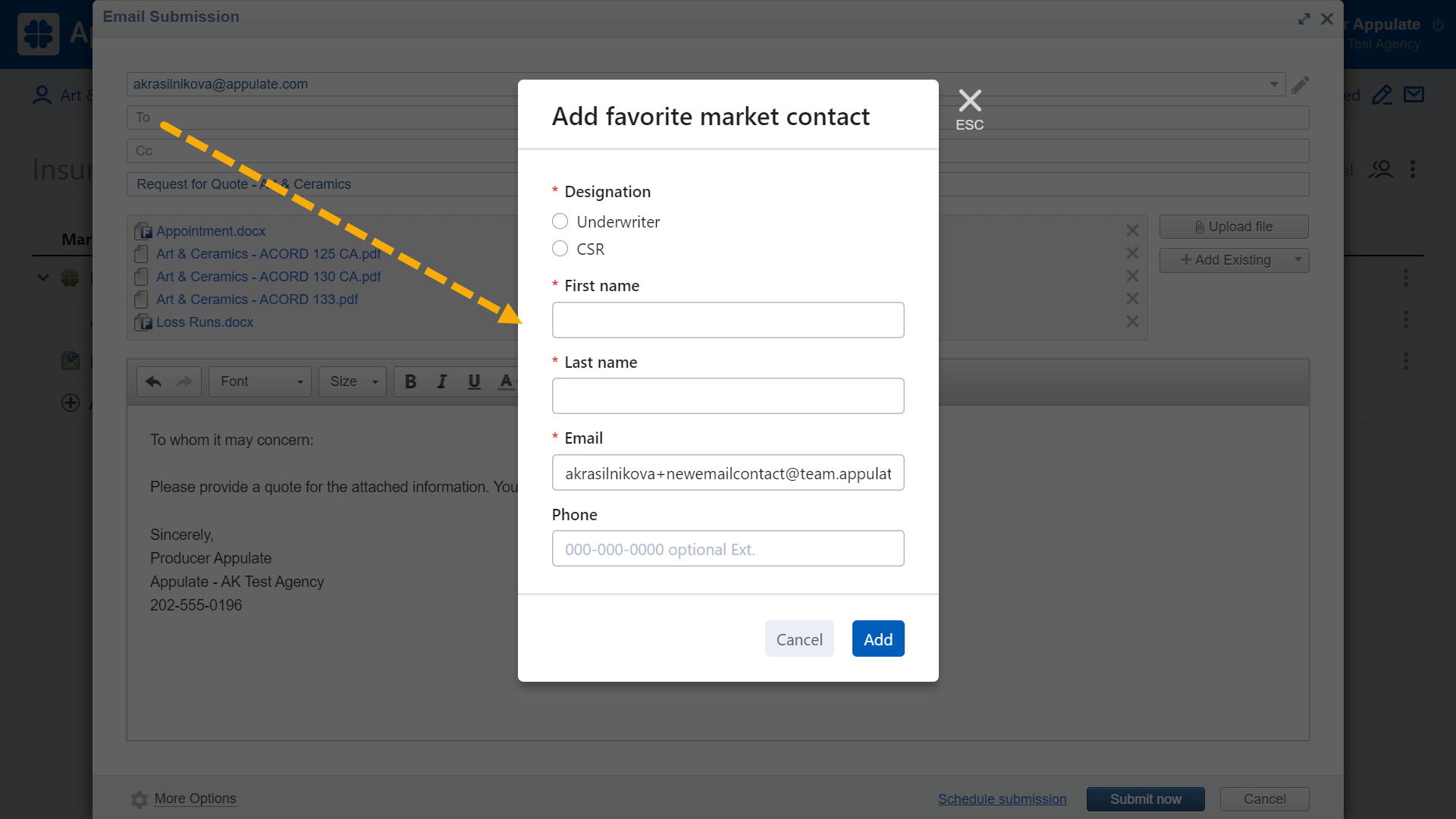 Note: The dialog opens when you click the Add new contact button in the tab's header. The Add new contact button will be hidden if the market uses Appulate as its only submission type.