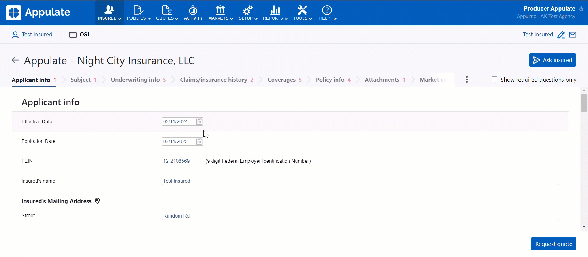 Effective and expiration dates are first set when you create a new request for a quote or a policy. You can set these dates individually for each quote request or policy, market, and quote.