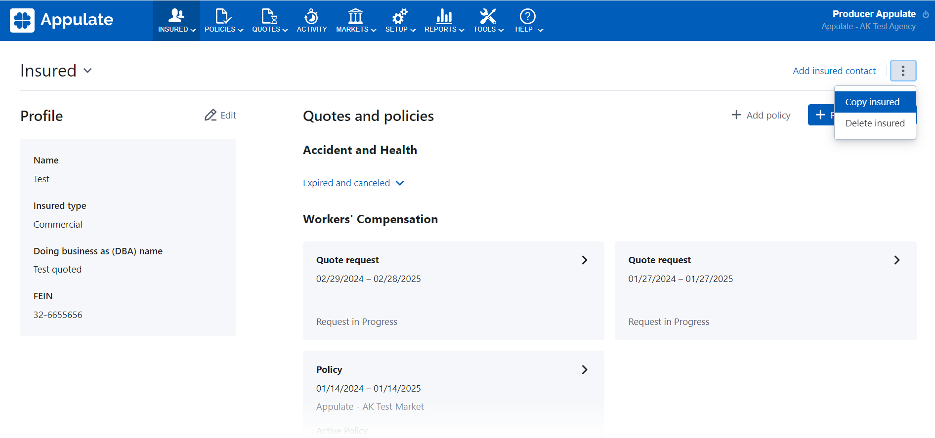- Insured menu > All Insured page. Just hover over the insured you want to copy and click the Copy button.