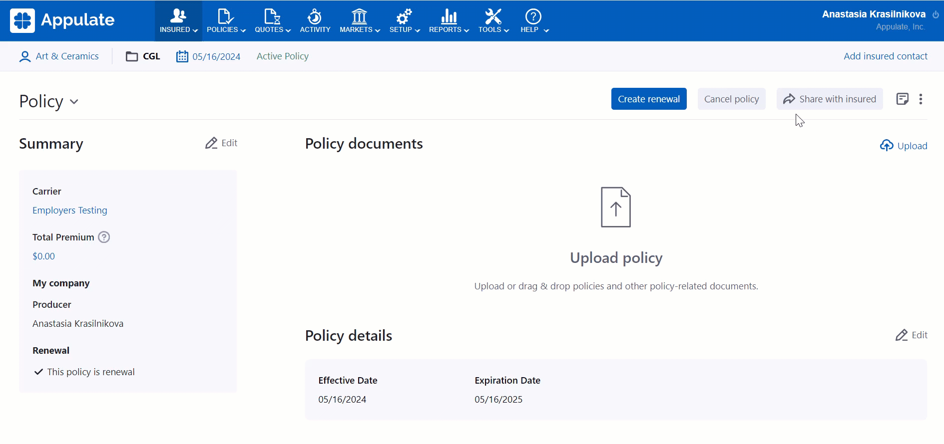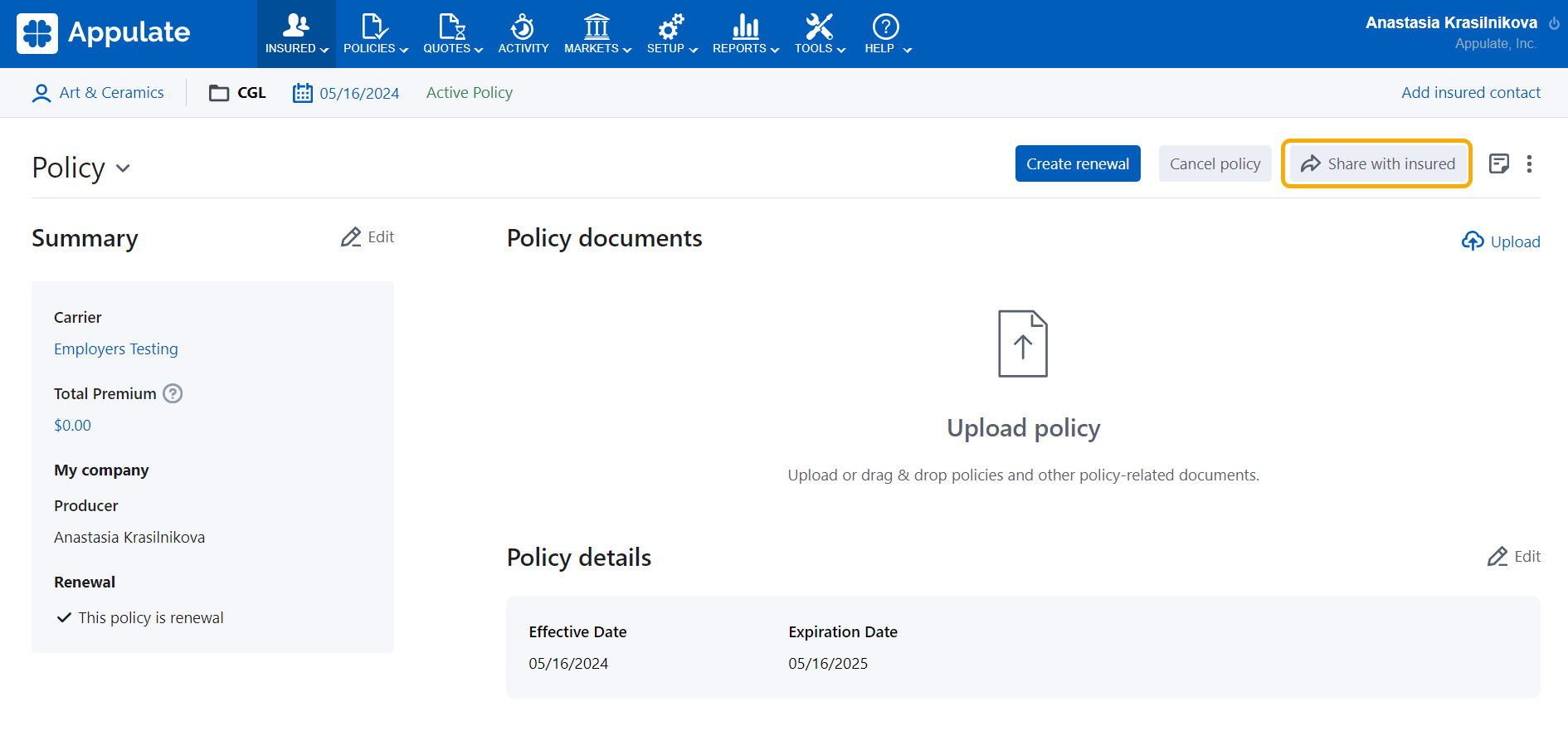 To share a policy, you need to click Share with insured in the upper-right corner of the Policy page.