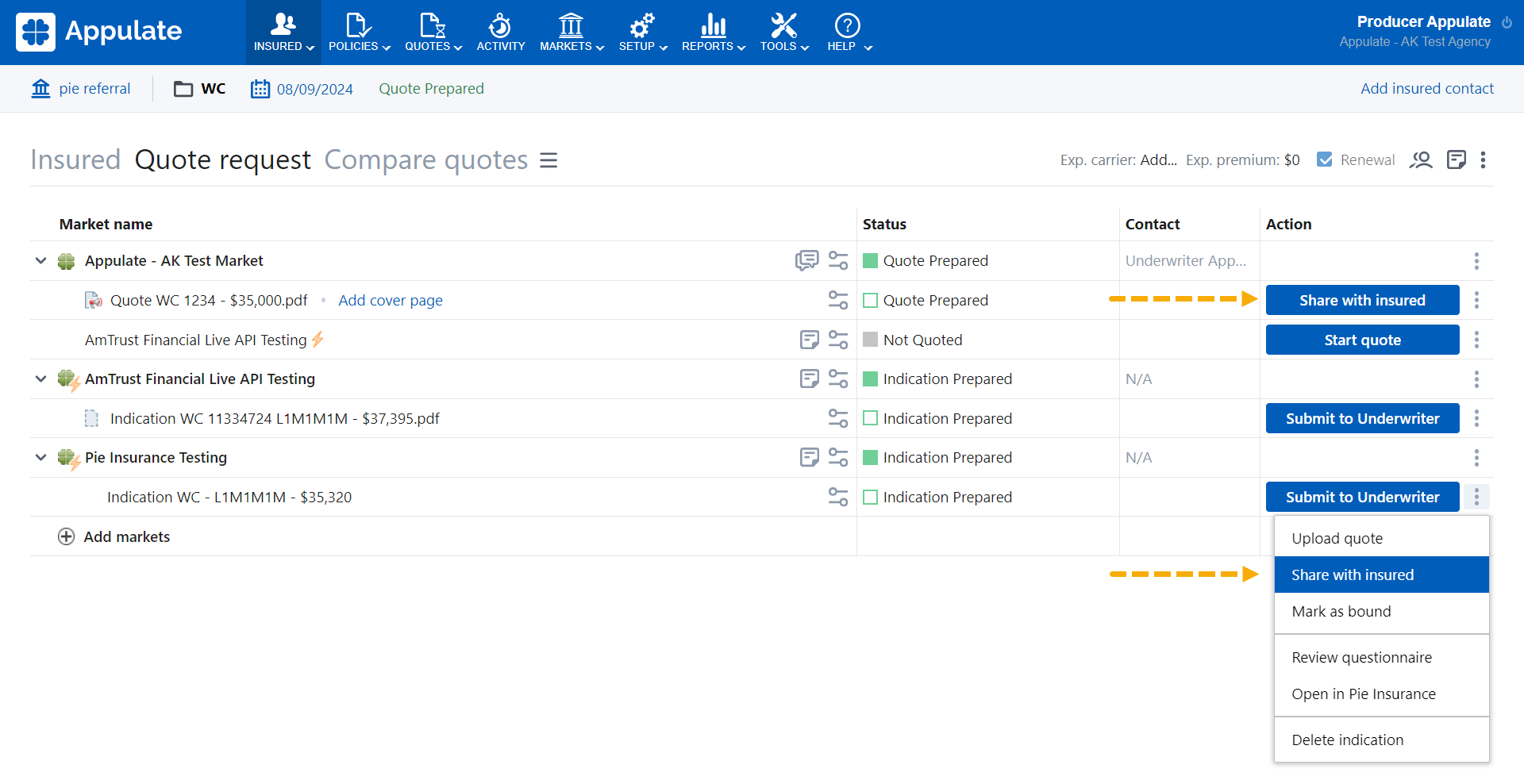 You can also click Share with Insured (for one or multiple quotes, indications, or premium estimates at once) on the Compare quotes page.
