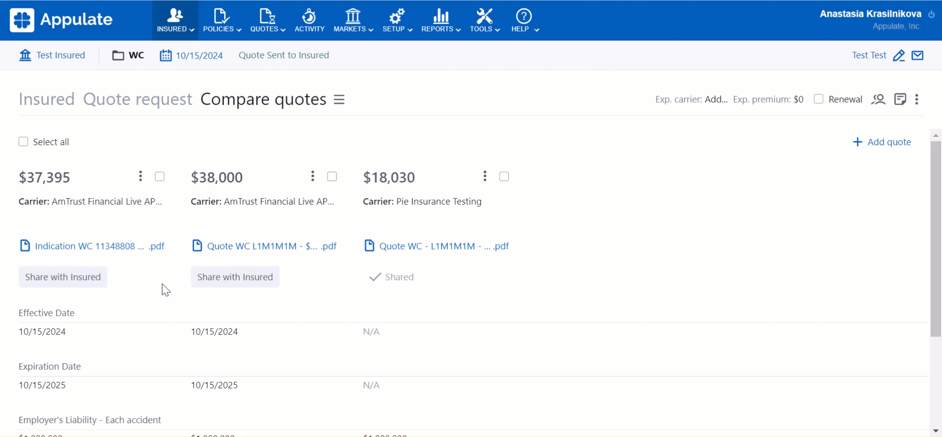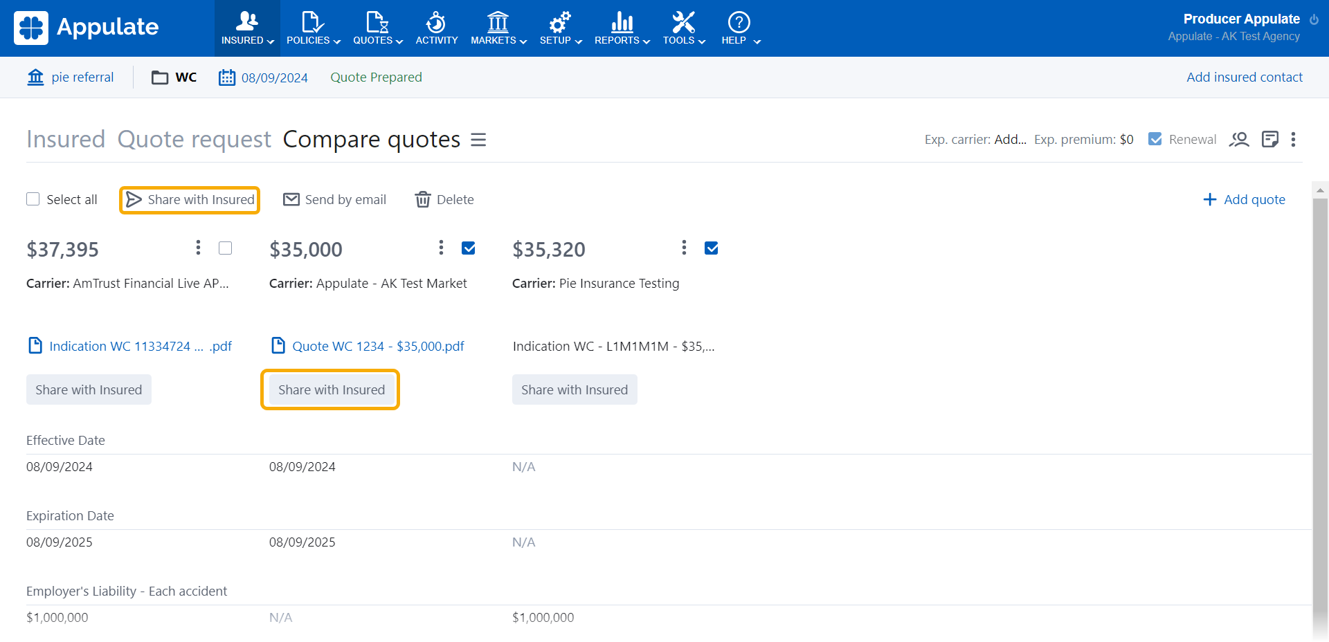 Tip: On the Compare quotes page, you can share one quote with the insured by clicking its Share with Insured button. You can also share several quotes at once: select these quotes and click Share with Insured in the group actions.