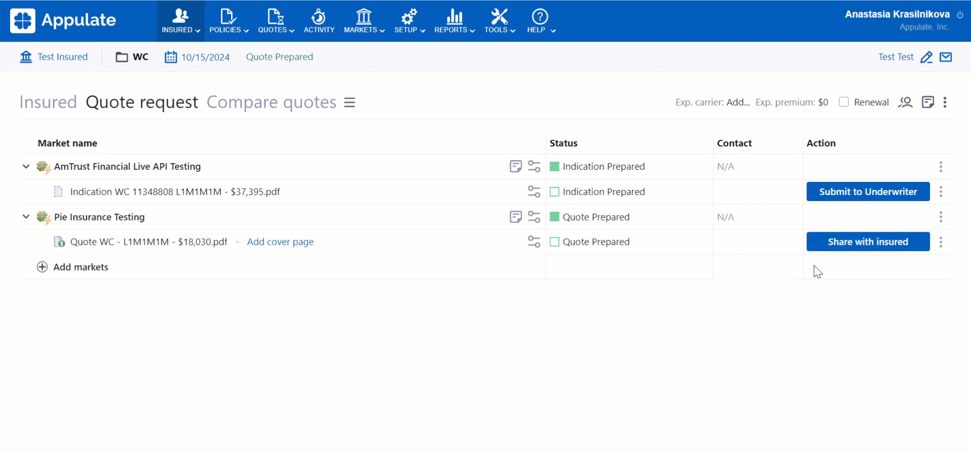 If the insured accepts or declines this quote or indication, you can change its status in Appulate: Accepted by Insured or Declined by Insured.