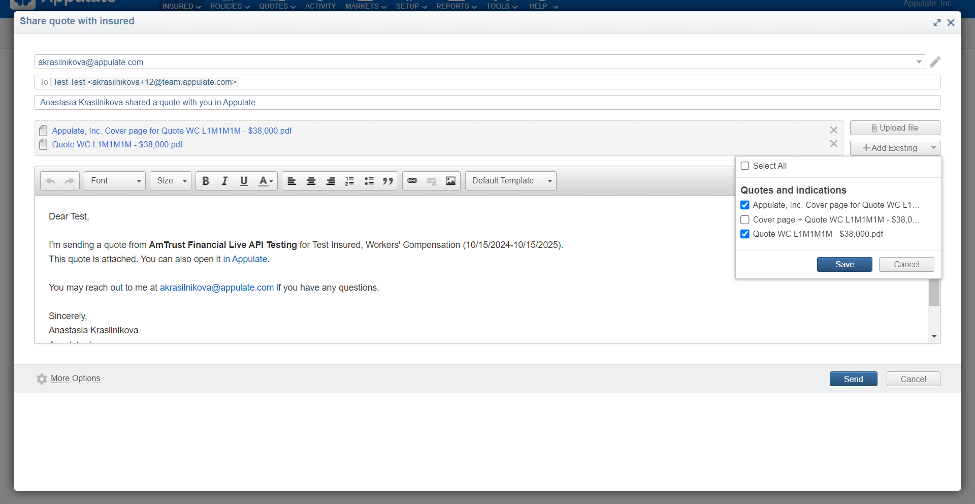 The shared quote or indication and (if available) the quote's cover page are attached. If you're sharing multiple documents, all will be attached, including the quotes cover pages.