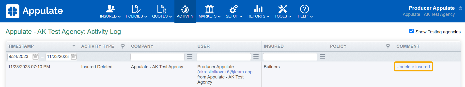 To restore deleted insured, you need to open the Activity log by clicking the Activity in the header and find an Insured Deleted event.