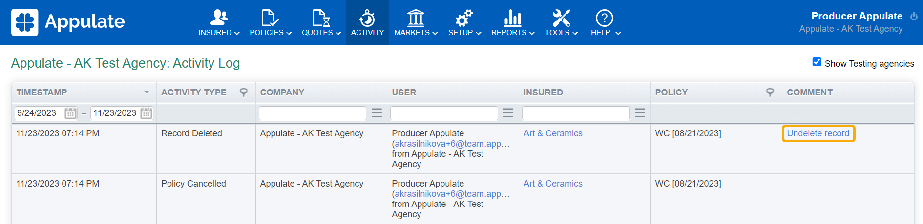 You can restore deleted Insured and their submissions and Policies in Appulate.