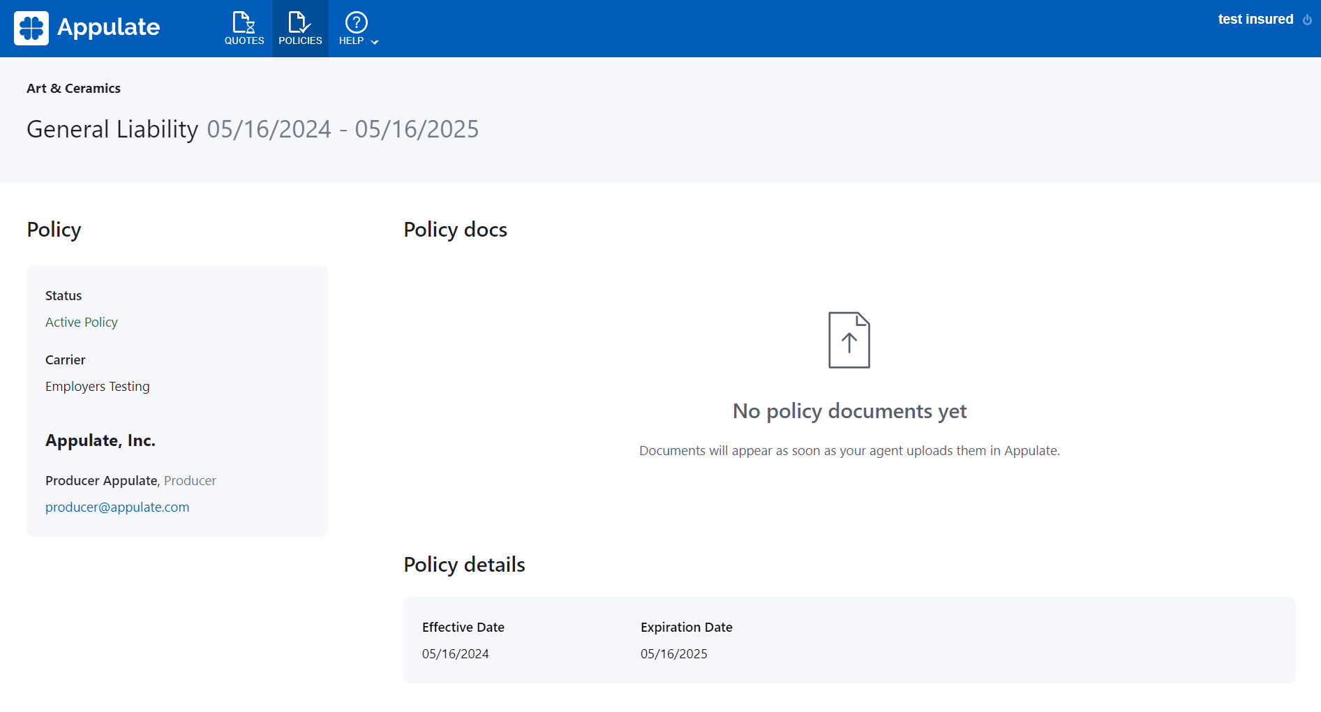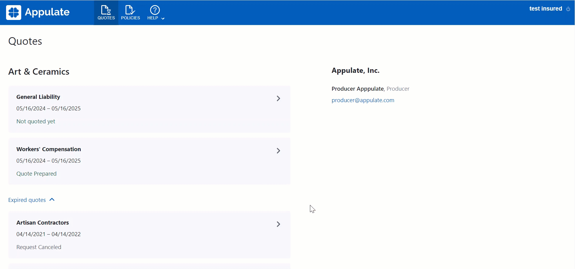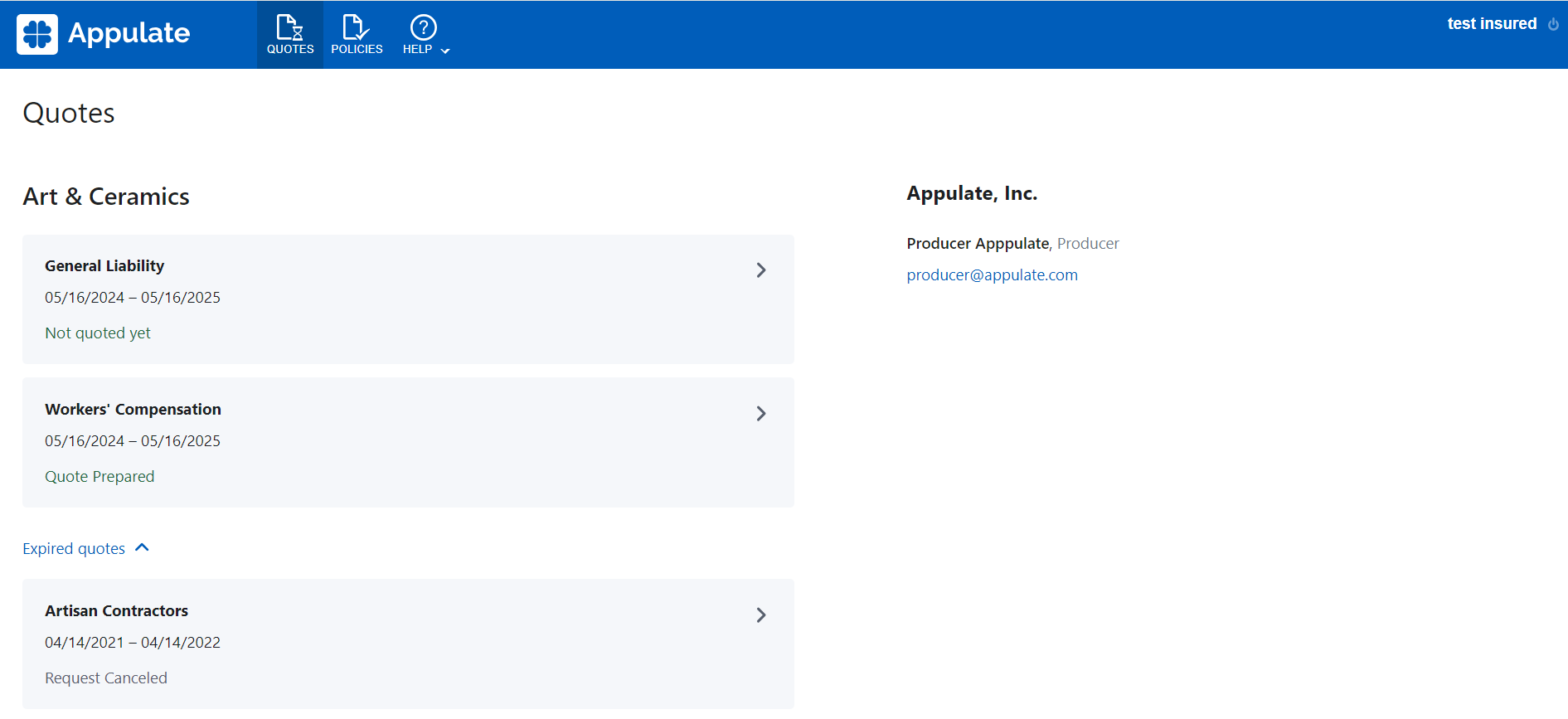 An insured user is a person who is specified as an insured contact and joins Appulate by invitation from an agency user who is in charge of handling this insured's quote requests or policies. See also How to share submissions and policies with insured.
