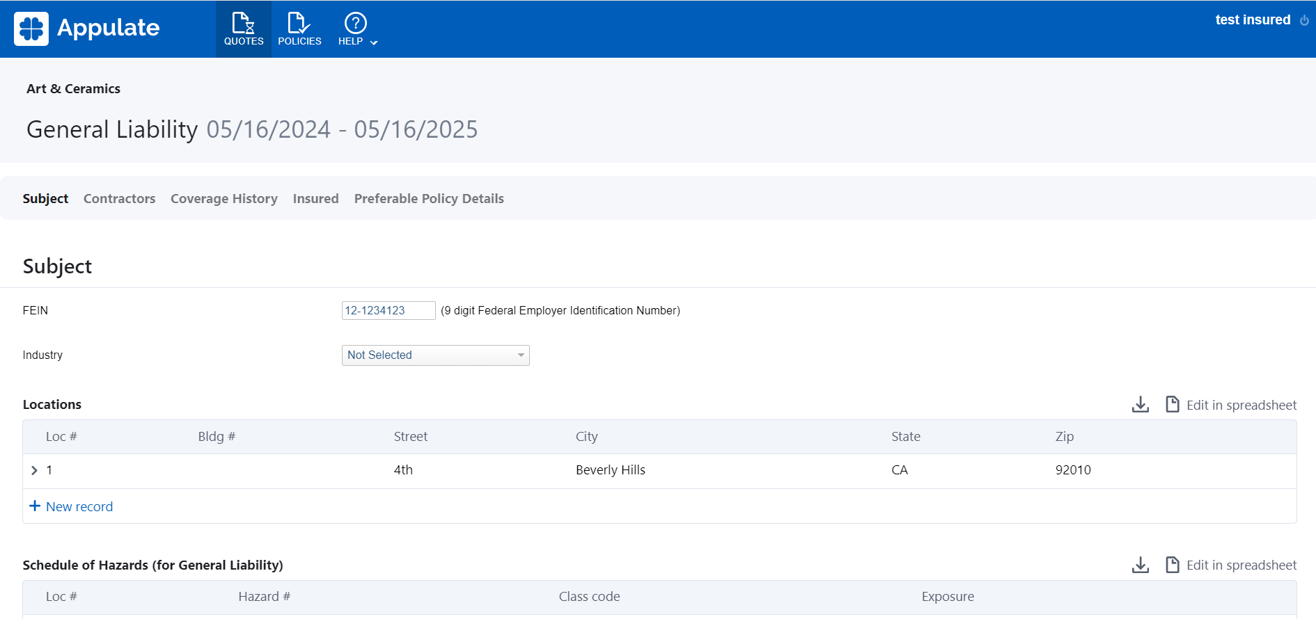 Note: The Quotes tab only shows the limits used for calculating the premium.