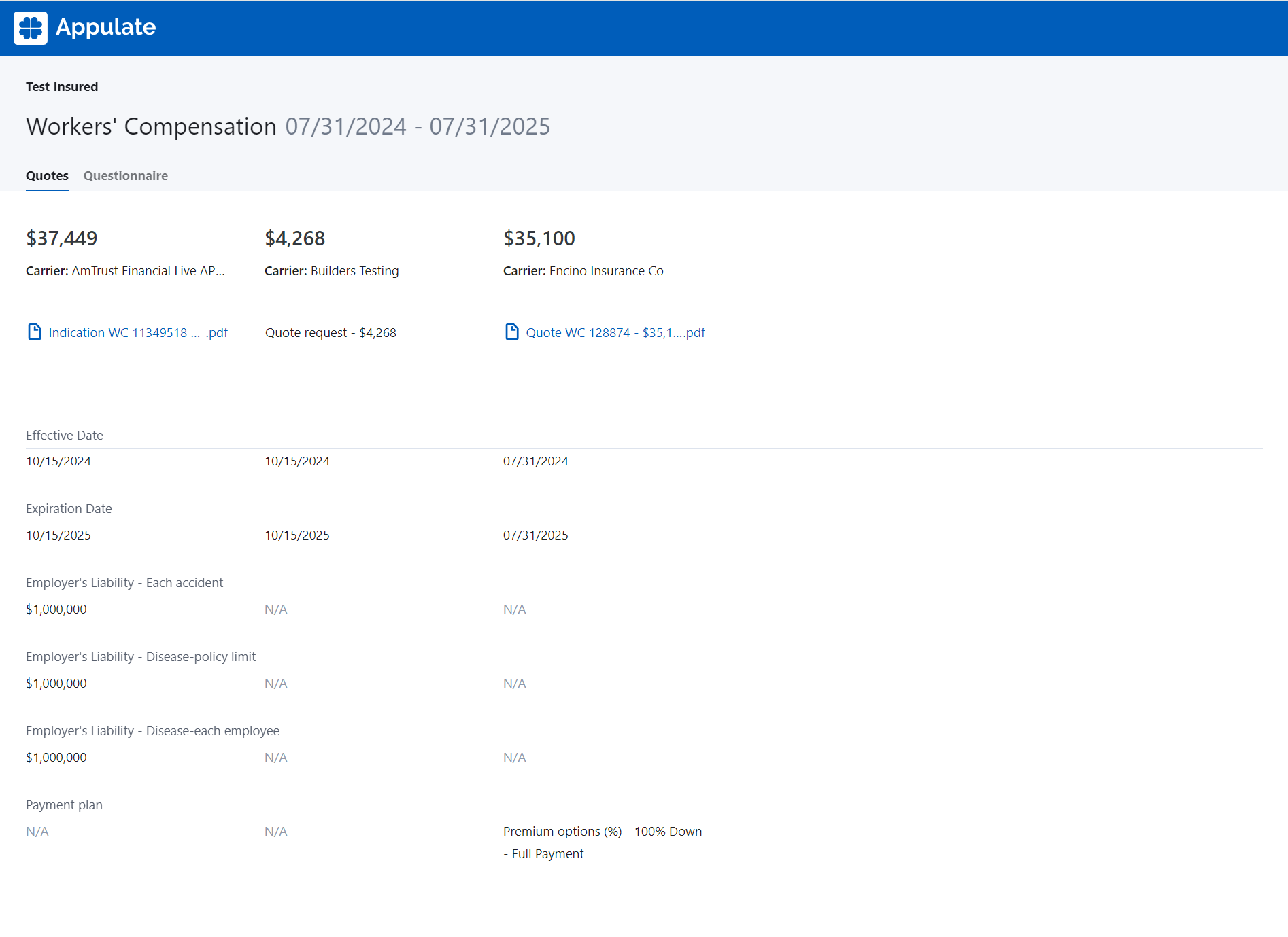 - The quote details (for example, limits, deductibles, or the selected payment plan). They will be shown if at least one entity has this information. If a value isn't available, N/A will be displayed. If an entity doesn't have any limits or deductibles, — will be displayed in place of their value. If their value is 0, $0 will be displayed.