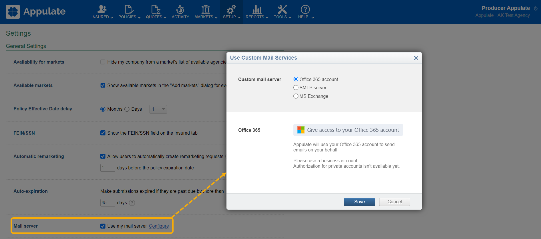 3. Find the Mail server setting under General Settings, select the Use my mail server checkbox, and then click Configure.