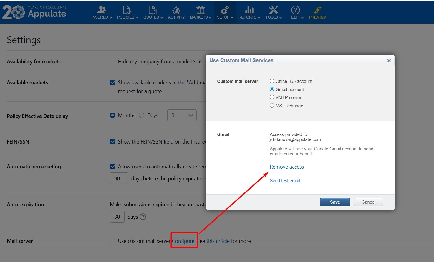 - If you are using Google account, click Configure and Remove access in the SETUP and Settings page. Then, click Give access to your Google Gmail account and log in using the appropriate account.