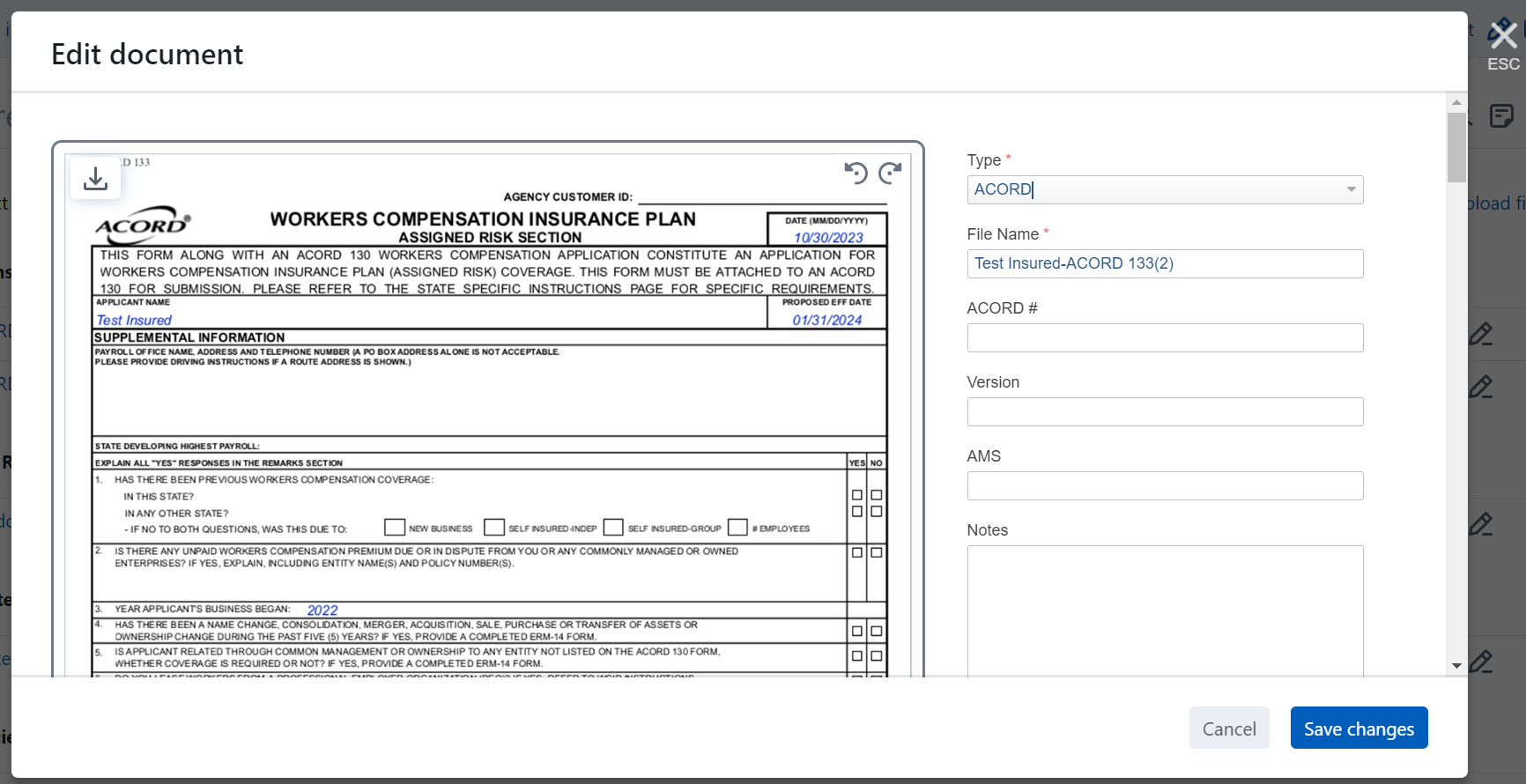 will open the Edit document window to make changes (file name, type, notes, etc.).