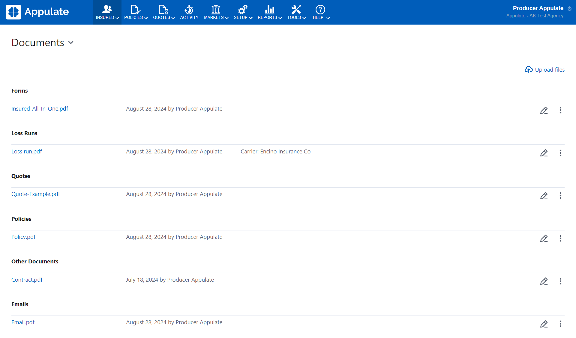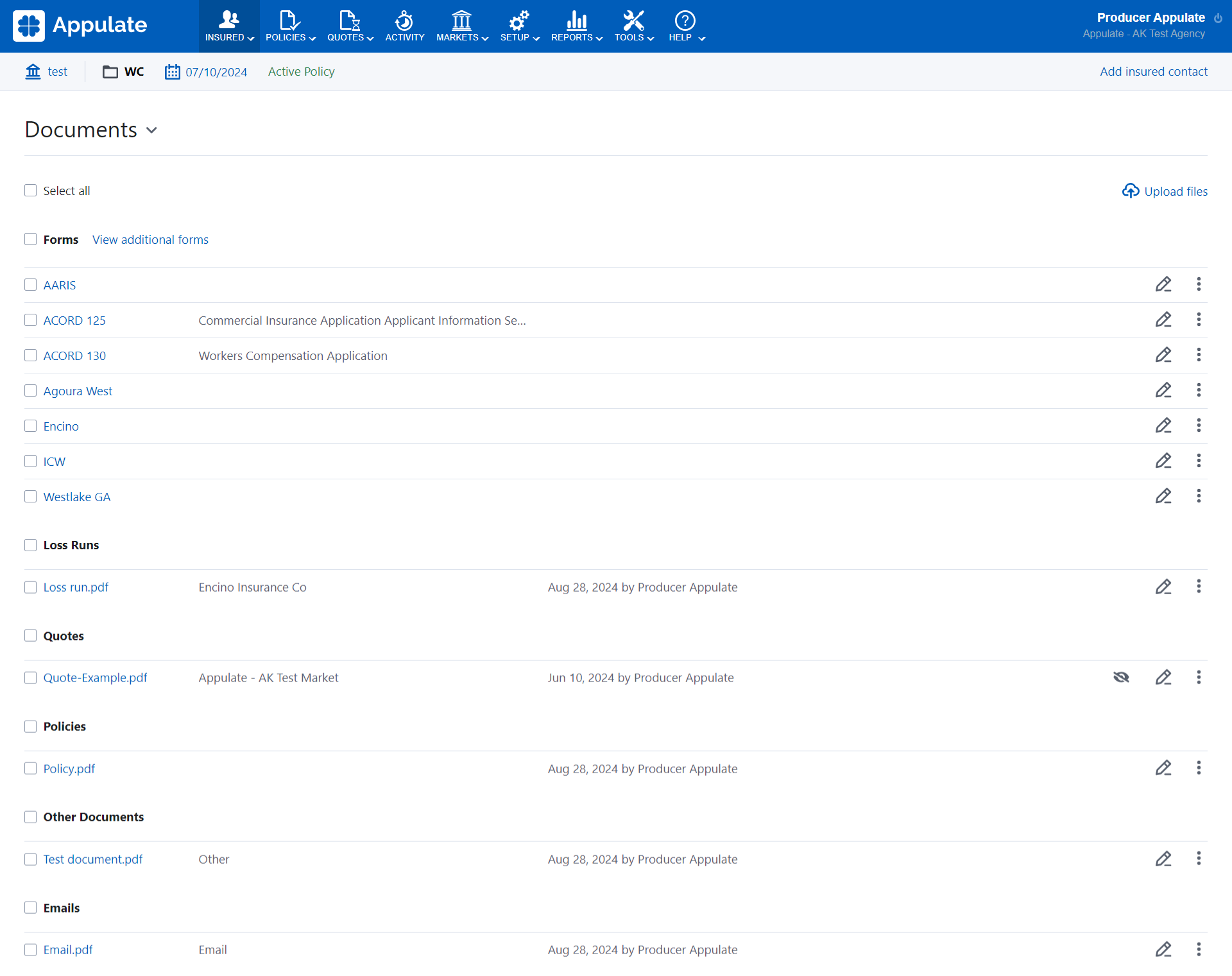Forms generated by Appulate will appear in this group. You can also upload new ACORDs and Supplementals.