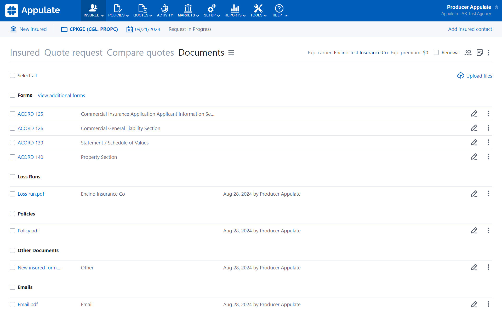 Appulate's Documents page now has all the documents needed for a quote request or policy. There is also the Insured documents page with all insured-related documents.