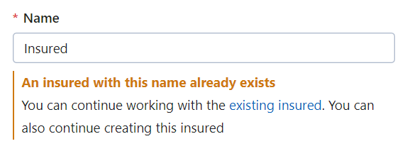 If an insured with a similar name already exists, a notification will appear. You can click existing insured to view all insured with a similar name. You can also continue creating this insured.