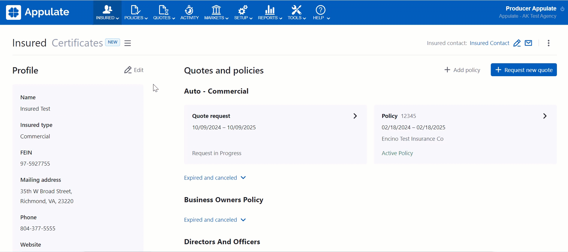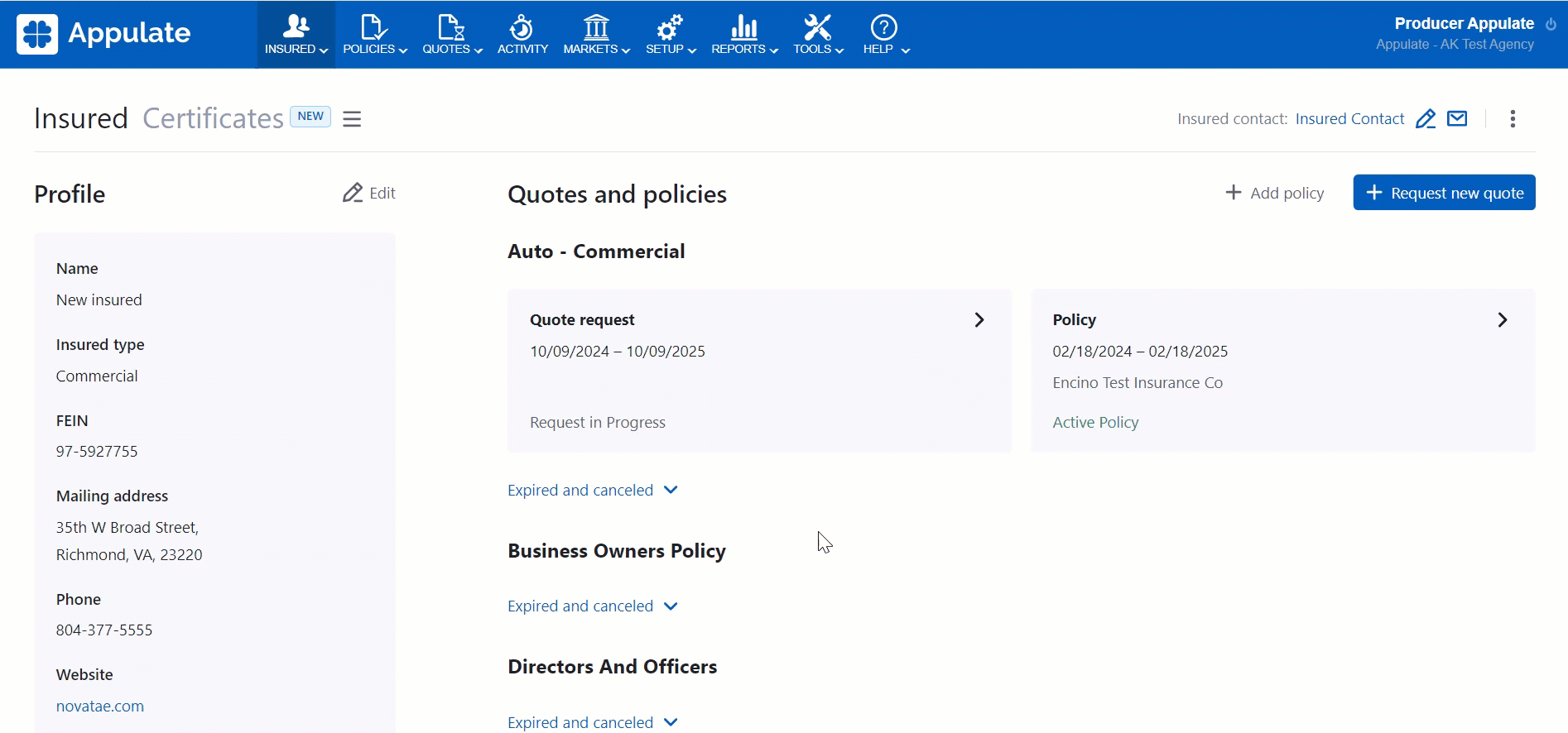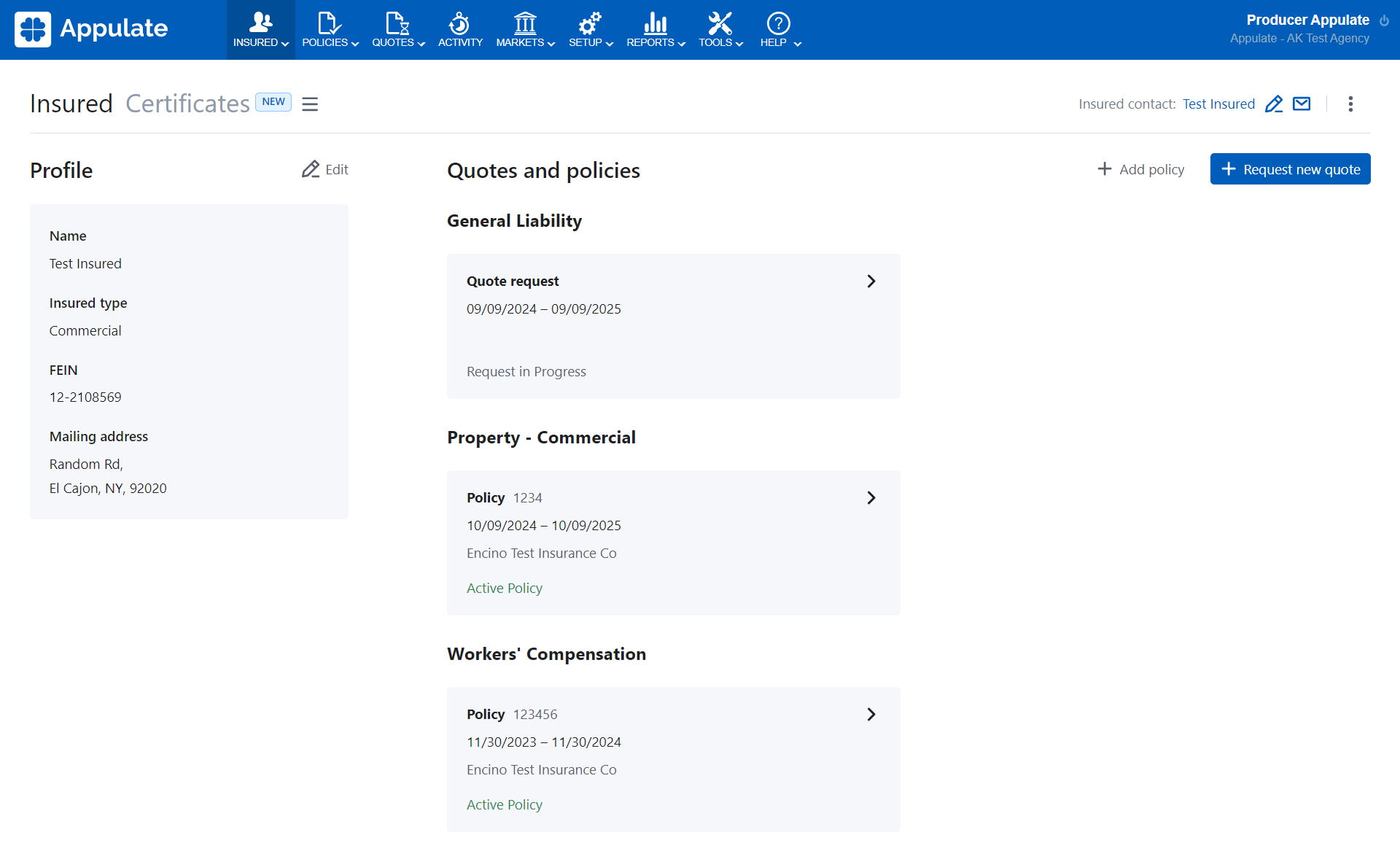 After you have created an insured, you can request a new quote or add a policy on their Insured page.
