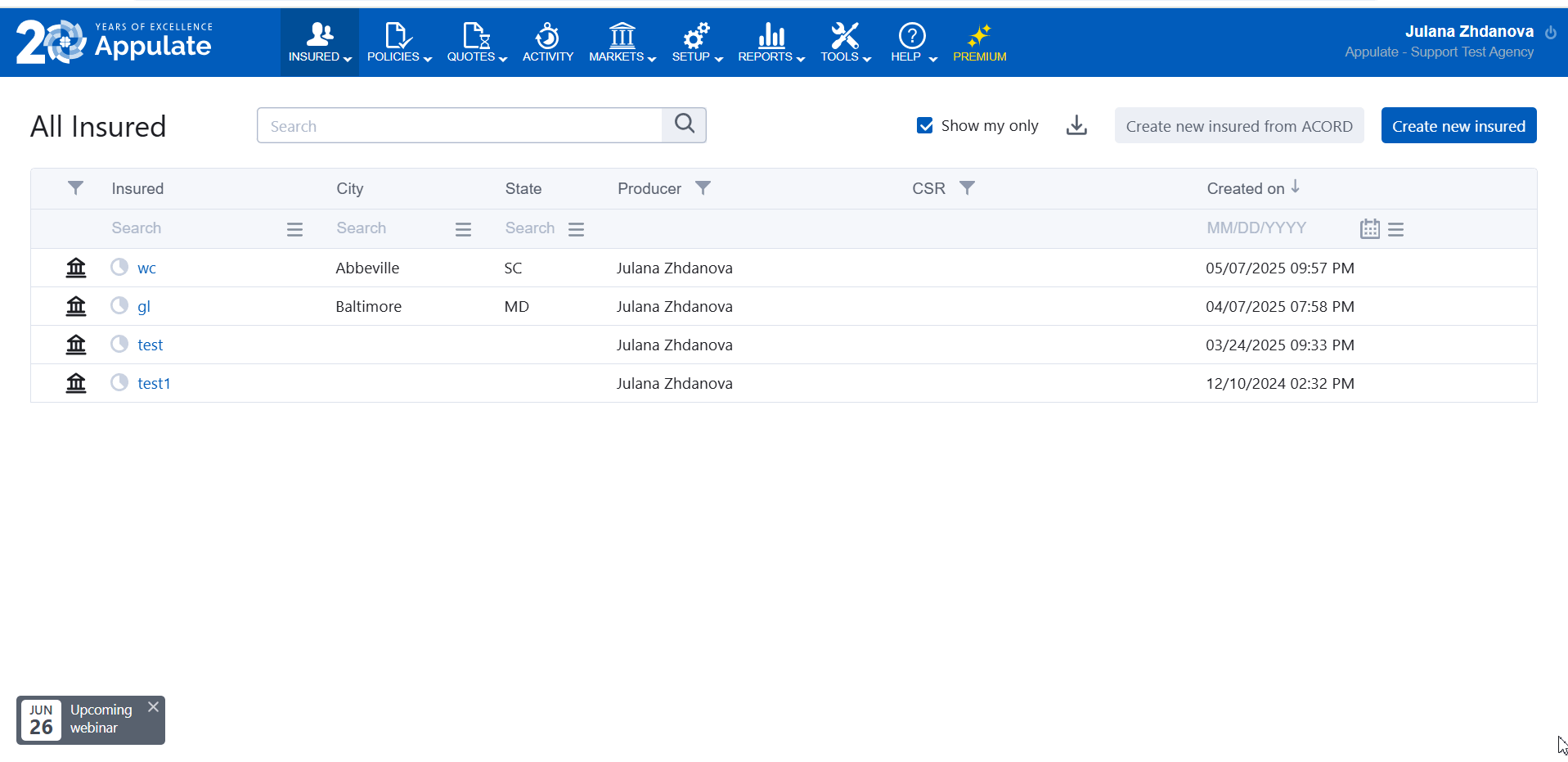 - Create new insured from ACORD on the All Insured page (Insured menu);
