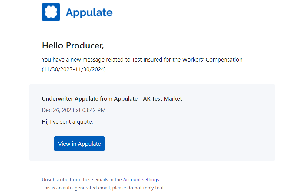 These emails inform the recipient of any new messages, including the sender's name and the company, the date and time of sending, the message text, as well as the link to view the message in Appulate.