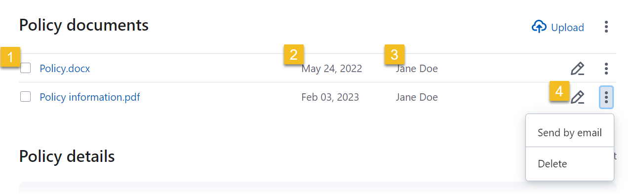 If the Policy documents section has one or more documents, group actions will be available. You can download the documents, send them by email, or delete them (only for uploaded documents).