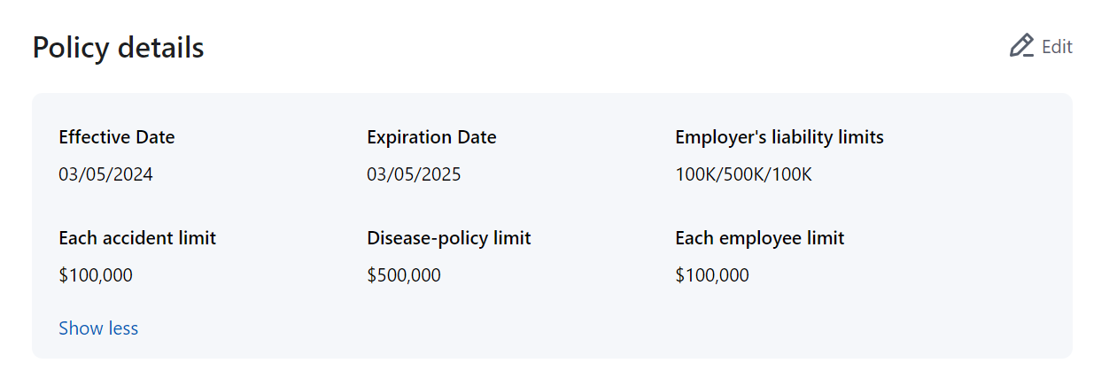 If the policy has no details (e.g. if you create it as a renewal), the section will display an empty state. You can fill in the details by clicking