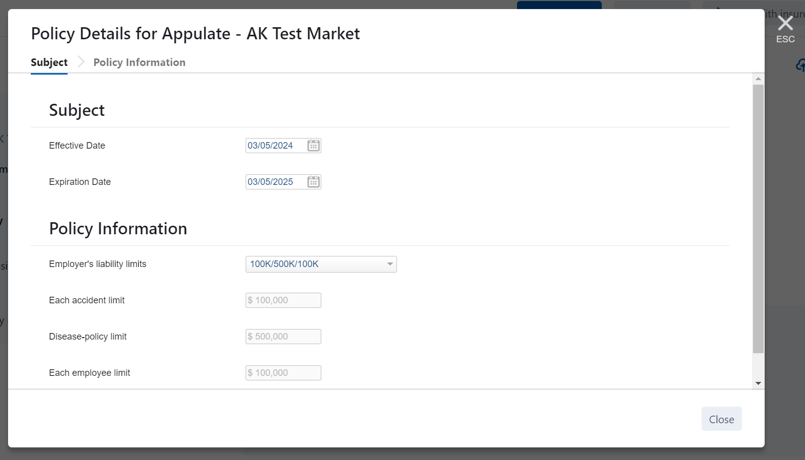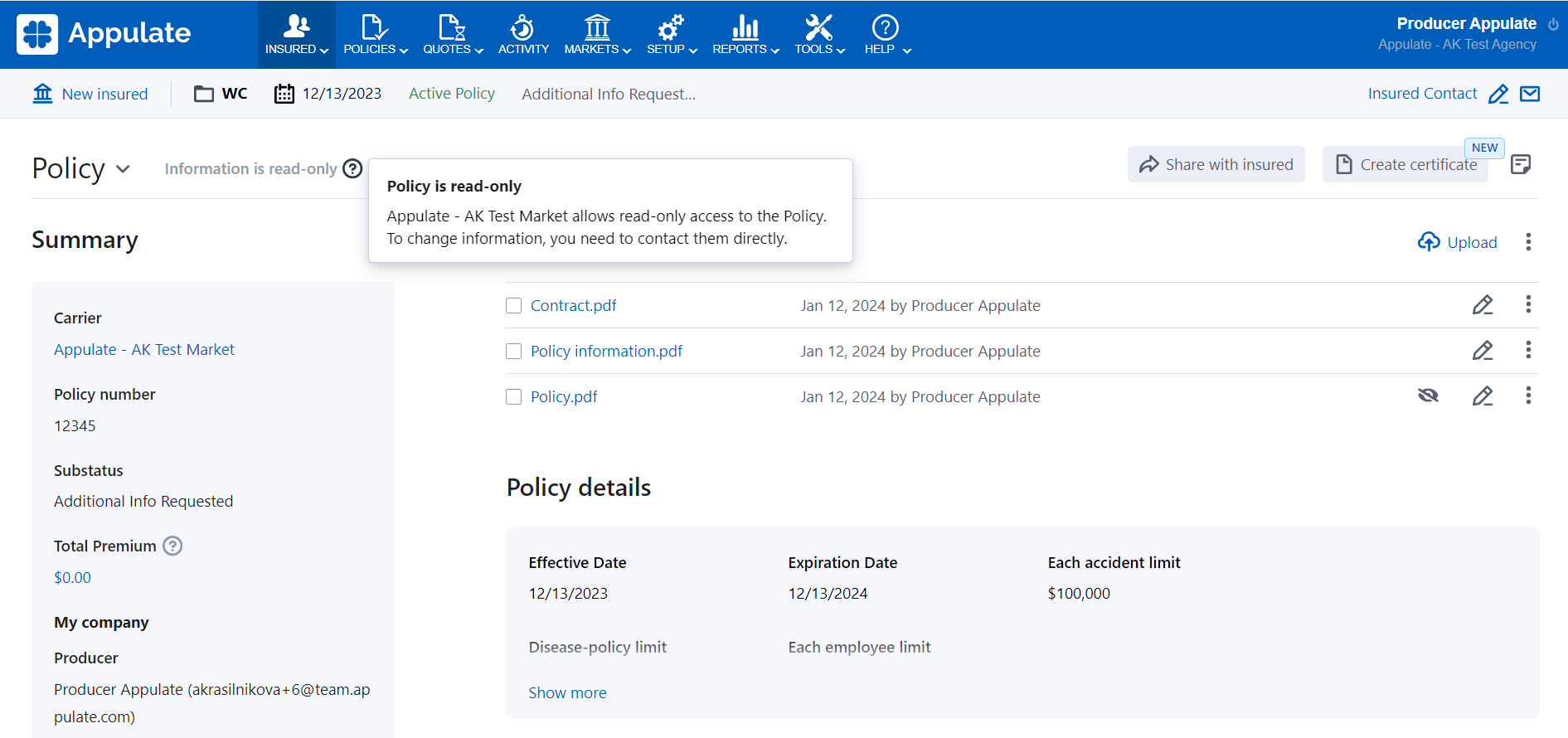 Some carriers may restrict access to their policies in Appulate. In this case, some policy information will be in read-only mode for agencies and/or MGAs: