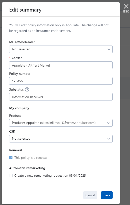 Automatic remarketing: Create a new remarketing request allows you to automatically renew an expiring policy. If this checkbox is selected in the Edit summary dialog, a new request for a quote with the same parameters will be created on a specified date. The date will be updated if you change the Effective Date on the Policy interface.