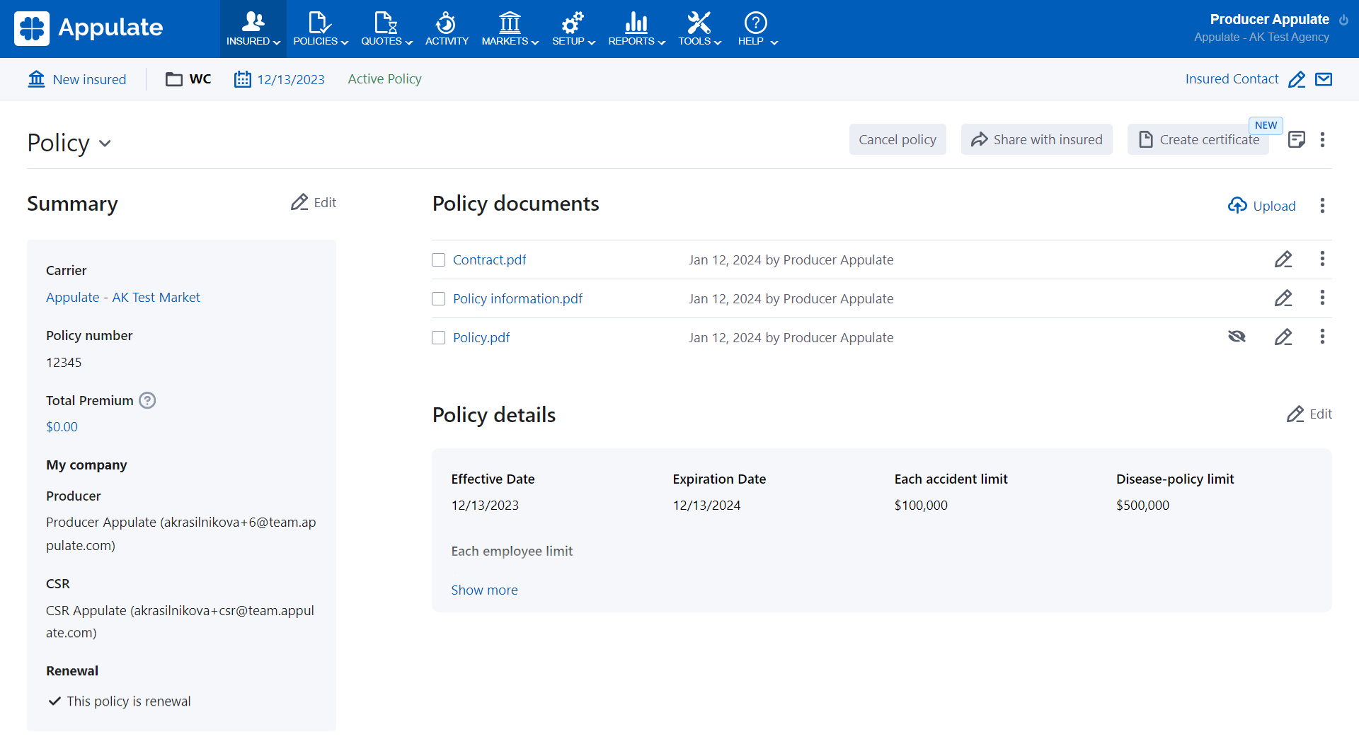 - Share with insured: Allows you to share this policy with the insured.