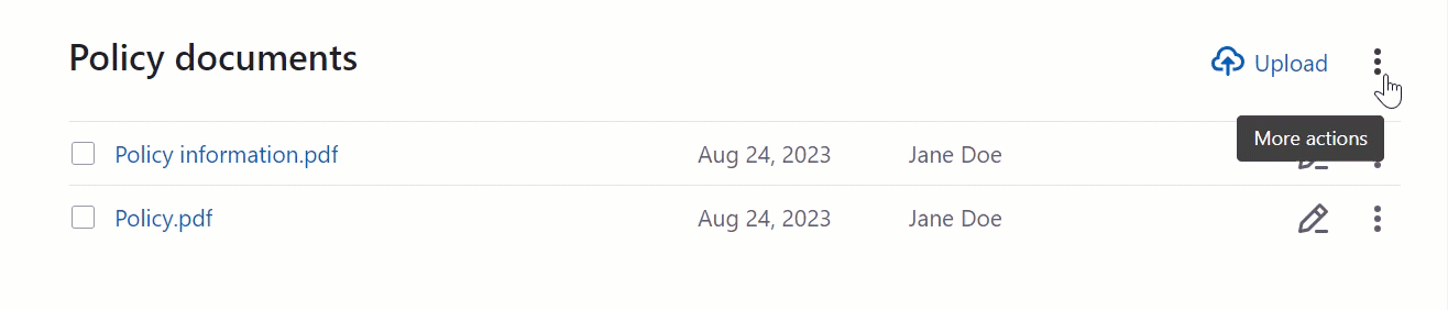 Group actions are displayed in the three-dot (More actions) menu if a document hasn’t been selected, or in the section header if one or more documents have been selected.