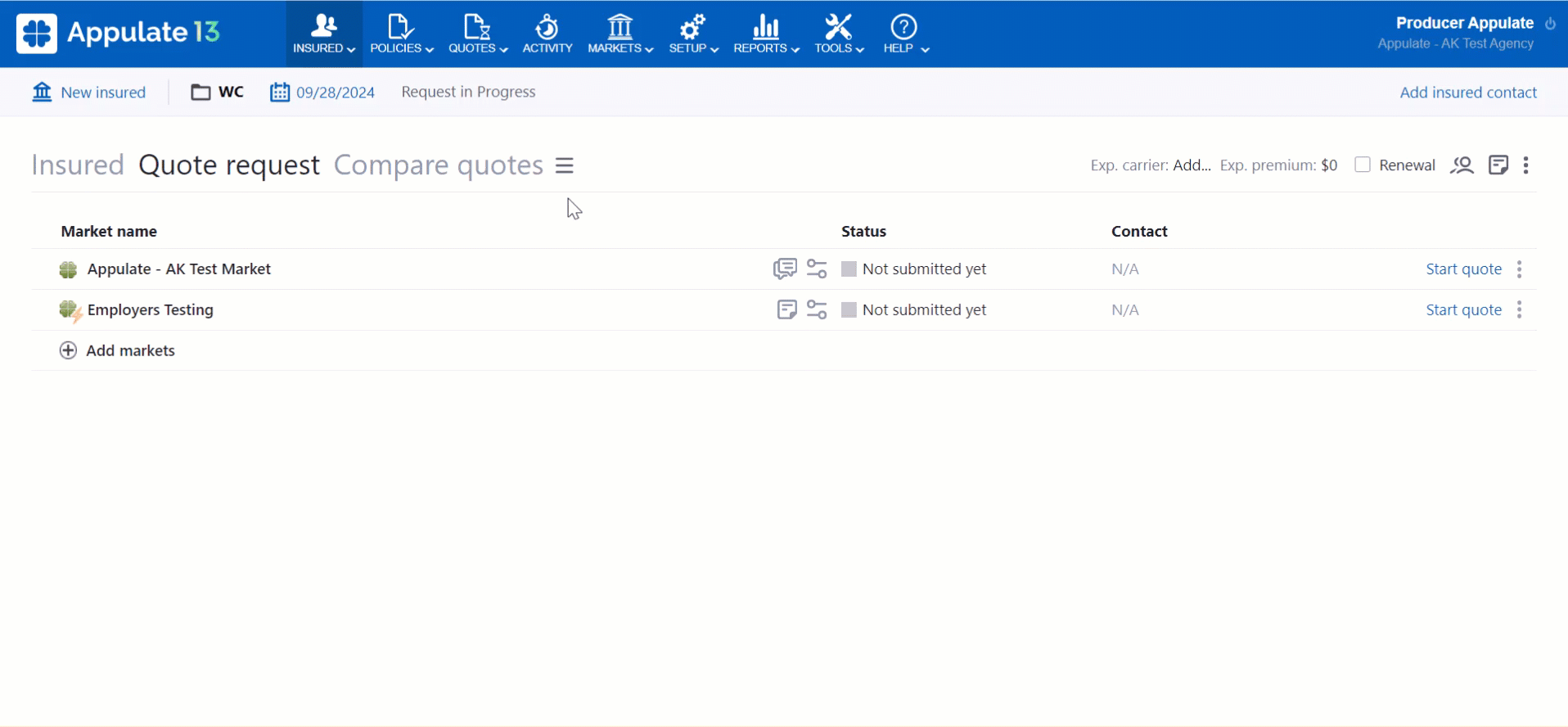 - Quote request: This is the main page with all actions needed to request a quote and bind a Policy. It has information about markets, quotes, and statuses. You can use it to open market-specific questionnaires by clicking a market's action button and filling in the Market Smart Q&A. This page opens by default when you create a new quote request.