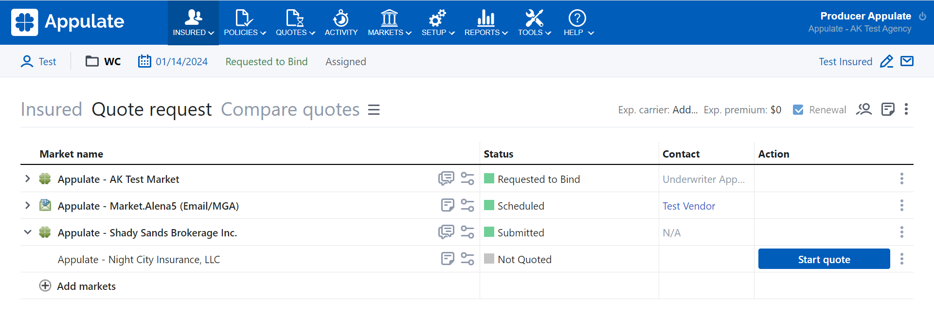 1. To start your quote request and see potential submarkets (carriers) and their requirements, click the Start quote button.