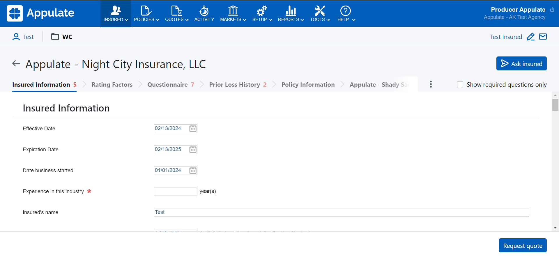 If this market doesn't have the Market Smart Q&A page, you need to fill in the questionnaire on the Insured tab to get a quote.