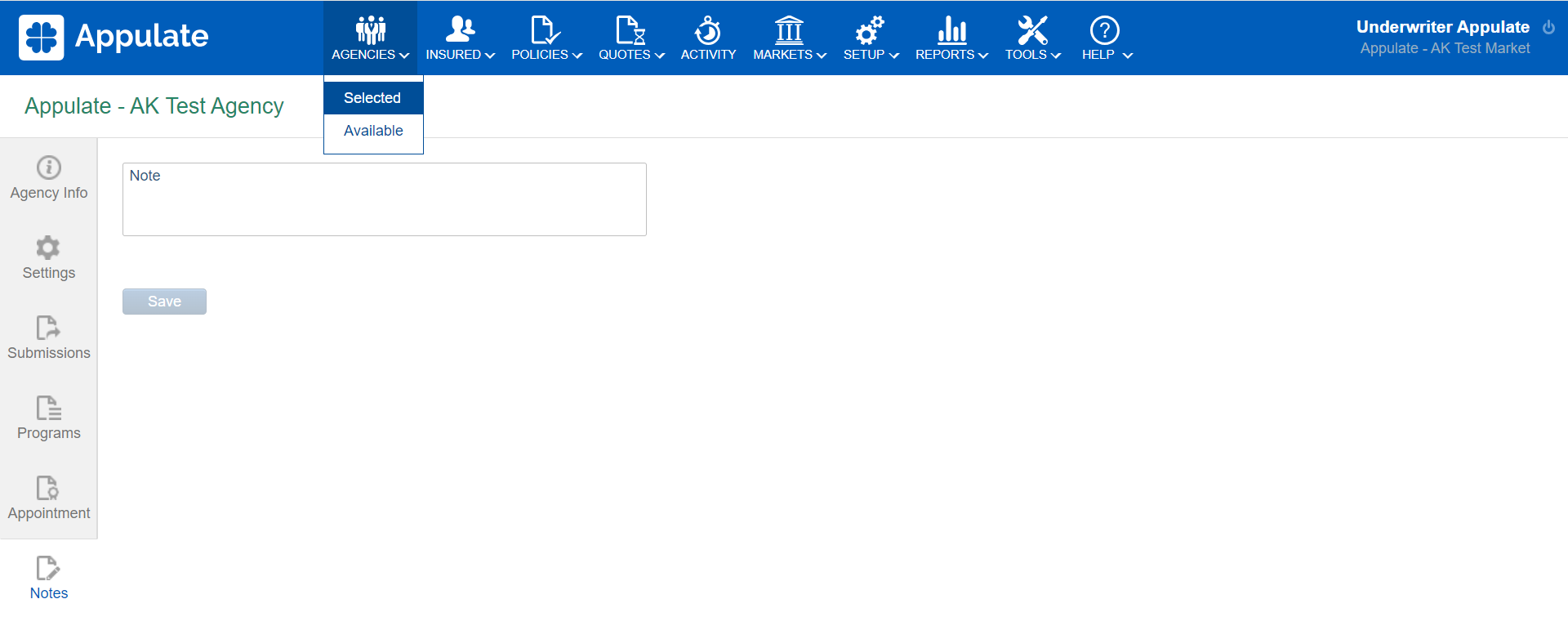 Market users can leave internal notes on selected agencies on the Notes tab: