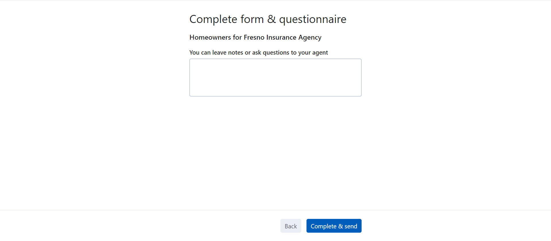 The notes left on this page will be displayed in the email to the agent (InsuredConnect) or the questionnaire's sender. The email is sent once the user clicks Complete & send.