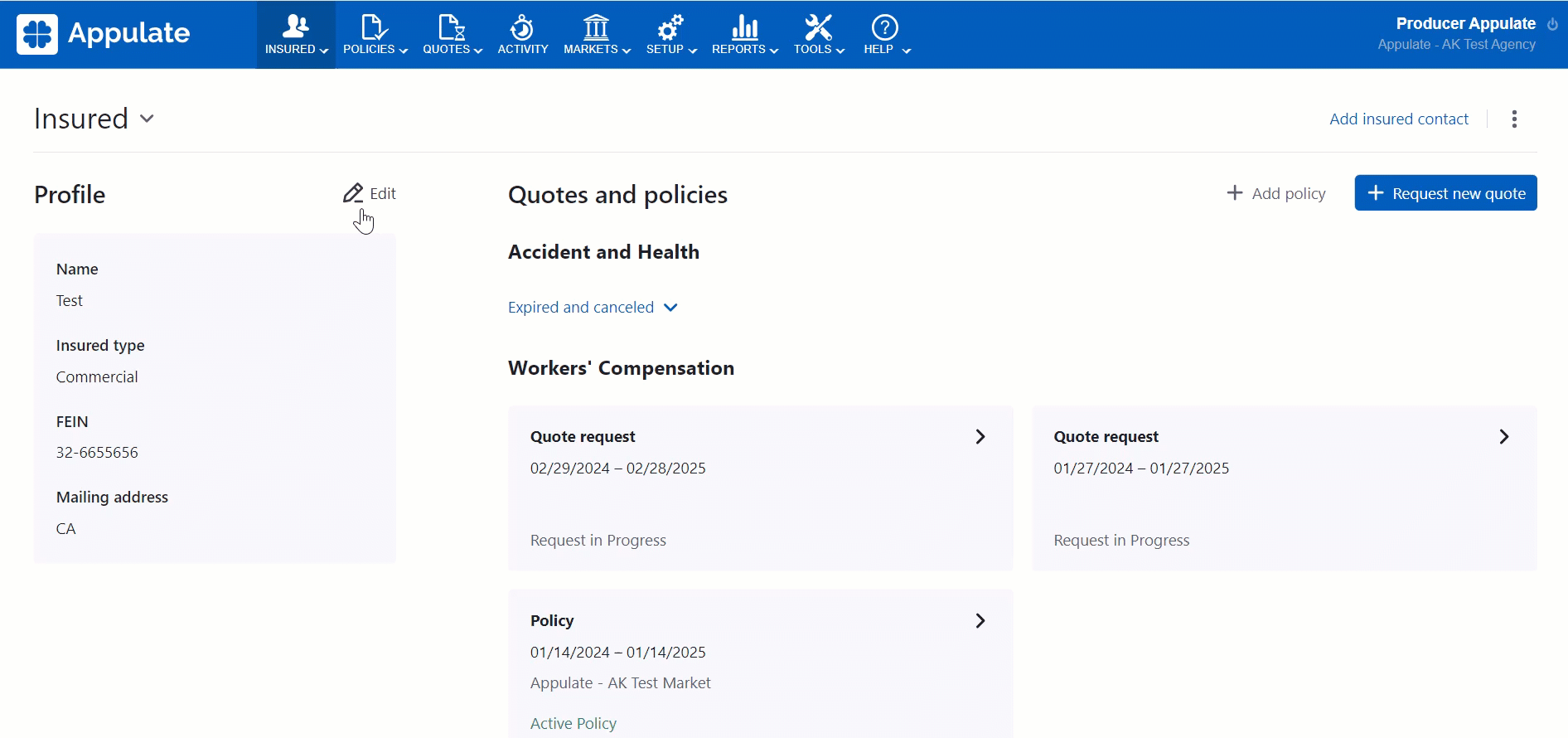 - To edit Internal notes for an existing insured, navigate to their Profile section and click Edit. Internal notes are part of the Edit insured dialog.
