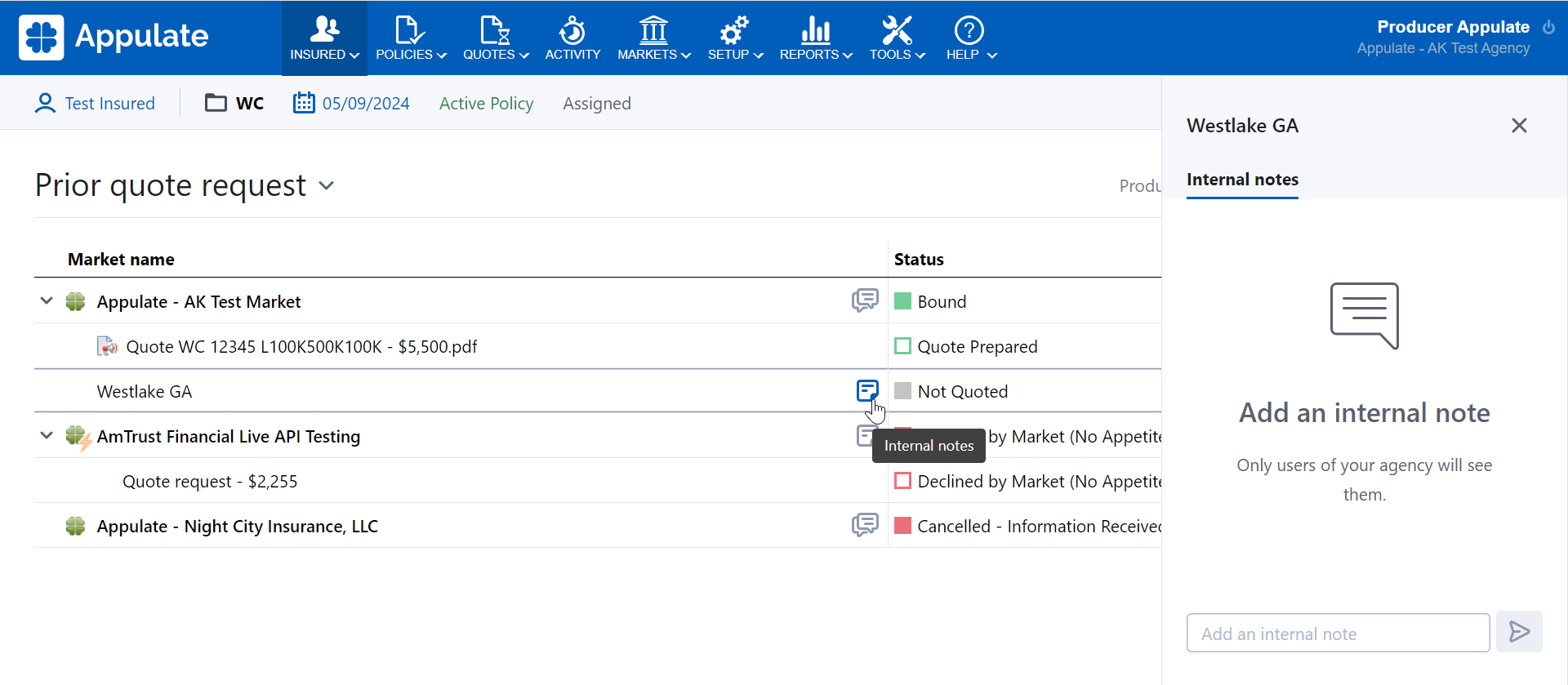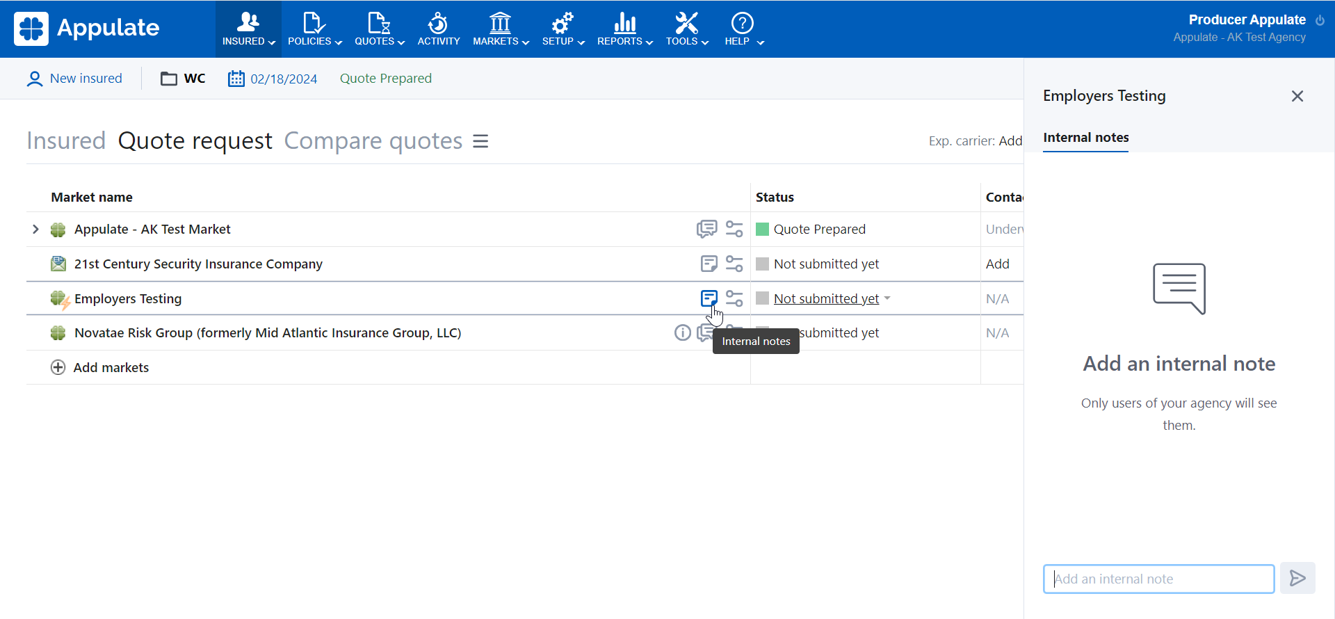 Note: Notes on the insured, agencies, and questionnaires are managed differently from the rest. The below steps are for managing notes on quote requests and policies, as well as markets.